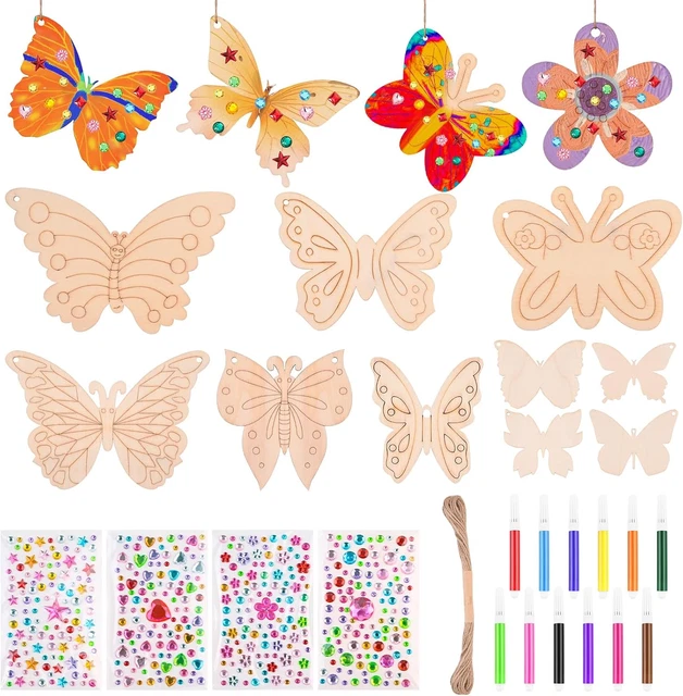 Kreativer Bastelspaß für Kinder! Dieses Noaxylic Set enthält 40 Teile: 12 Holz-Schmetterlinge, 12 Holz-Blumen, 12 Aquarellstifte, 4 Bögen Edelstein-Sticker und 30 Schnüre. Alles aus hochwertigem Pappelholz mit glatten, gratfreien Kanten - absolut sicher für kleine Hände. Die 7,5x7,5cm großen Motive sind perfekt zum Bemalen und Verzieren. Kinder können ihrer Fantasie freien Lauf lassen und wunderschöne Anhänger, Mobiles oder Deko-Stücke kreieren. Fördert Feinmotorik, Kreativität und Farbverständnis. Perfekt für Kindergeburtstage, Bastelnachmittage, Kindergarten oder Grundschule. Auch super für Familienfeiern, Ostern, Weihnachten oder als Geschenk. Die fertigen Kunstwerke können mit den beiliegenden Schnüren aufgehängt werden. Alles in einer Box - kein zusätzliches Zubehör nötig. Stundenlanger Bastelspaß garantiert! Einfach auspacken und loslegen - die Kleinen werden begeistert sein!