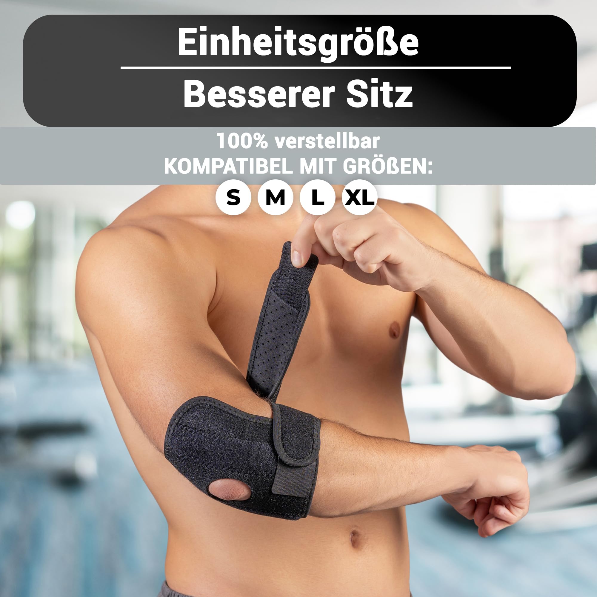 Bei Tennisarm oder Golferarm? Diese Bandage mit Silikon-Polster sorgt für gezielten Druck und Linderung. Einstellbarer Klettverschluss mit Memory-Skala für perfekte Passform (20-40 cm). Ultraleicht und atmungsaktiv - perfekt für Sport oder Alltag. Ob Tennis, Golf oder langes Arbeiten am PC - dein Ellenbogen ist bestens geschützt. Einfach anziehen, einstellen und schmerzfrei bewegen!