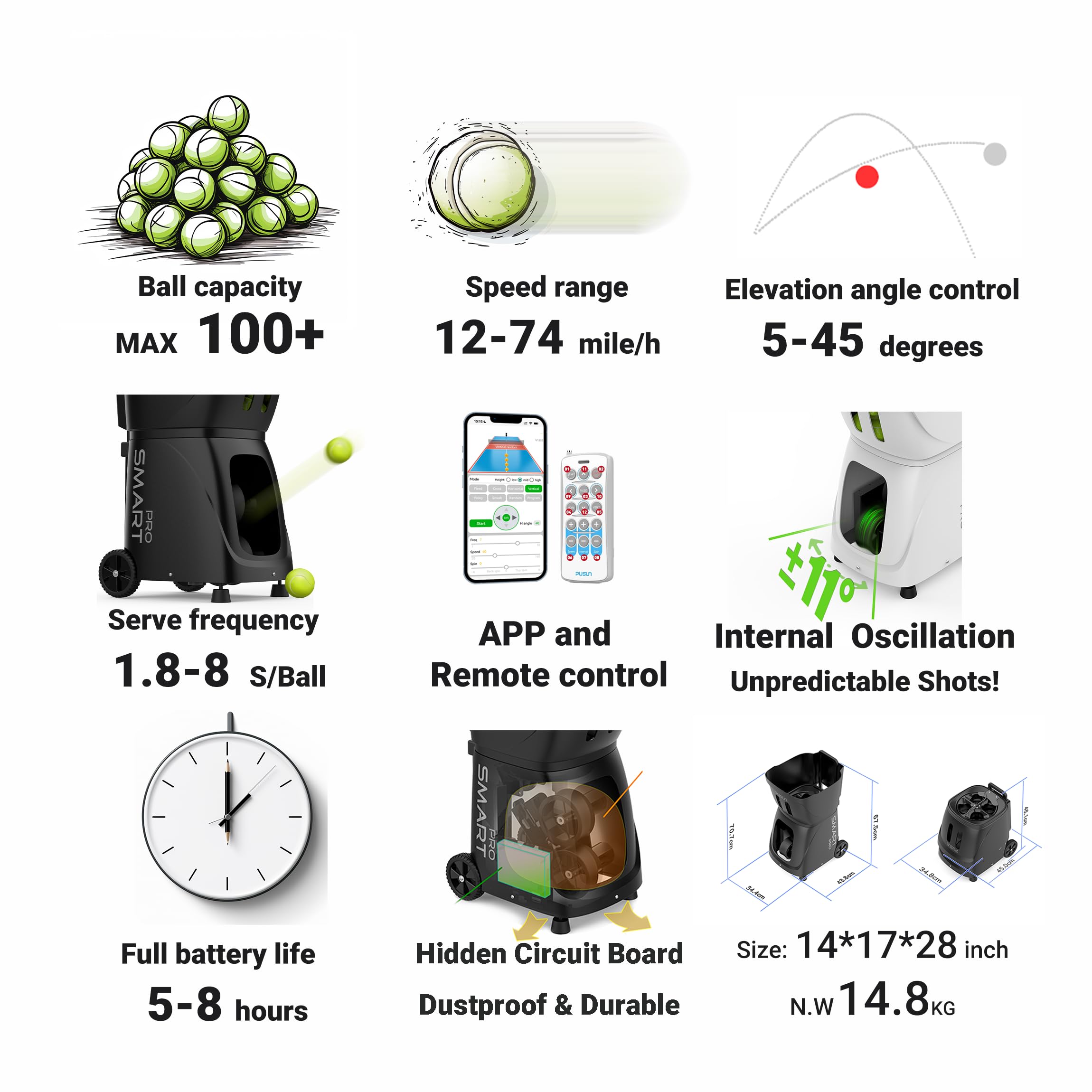 Wow, dein persönlicher Tennis-Profi! Diese intelligente Ballmaschine bringt dein Spiel auf nächste Level. Per App oder Fernbedienung steuerst du Geschwindigkeit (20-120 km/h), Winkel und Frequenz. Der starke Lithium-Akku hält 4-6 Stunden durch und fasst bis zu 100 Bälle. Super praktisch: sie lässt sich von 433x147,5cm auf 40,5x147,5cm zusammenfalten! Mit Trolley-System easy zu transportieren. 20 Zielpunkte und 12 Trainingsprogramme machen jeden Trainingstag abwechslungsreich. Ob Anfänger oder Profi - hier findet jeder das passende Programm. Endlich wie mit einem echten Trainer trainieren, aber viel günstiger!