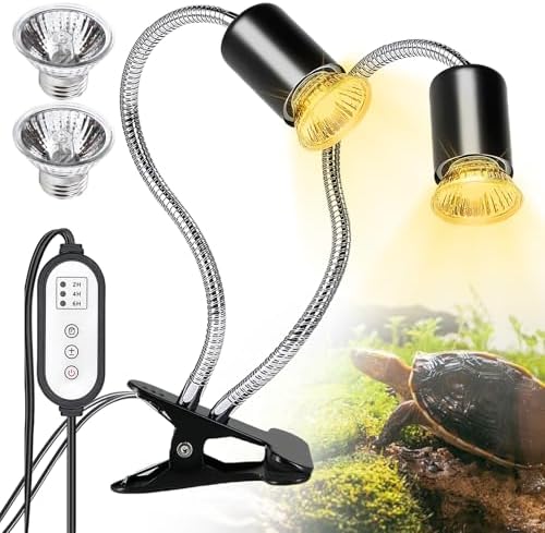 Perfektes Klima für deine Reptilien! Diese Doppel-Wärmelampe mit 360° drehbaren Köpfen bietet maximale Flexibilität. Inklusive 3 Lampen (25W, 50W, 75W) für verschiedene Temperaturbedürfnisse. Mit 97% UVA und 3% UVB für natürliches Licht, das Appetit und Verdauung fördert. Intelligenter Timer mit 2H, 4H, 6H und 24-Stunden-Zyklus. Perfekt für Schildkröten, Eidechsen, Schlangen und mehr. Schafft die ideale Wachstumsumgebung für deine Lieblinge!