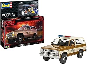 Hol dir ein Stück Hawkins nach Hause! Dieser offizielle Revell-Bausatz des Chevrolet K5 Blazer von Jim Hopper aus Stranger Things ist ein Muss für alle Fans. Im Maßstab 1:25 mit allen Details wie Blaulicht, Antenne und Polizei-Emblem. Alles dabei: Bausatz, Abziehbilder, Basisfarben, Kleber und Pinsel. Perfekt für Modellbau-Einsteiger und Profis. Baue das ikonische Auto aus den ersten drei Staffeln nach - inklusive der charakteristischen Schäden! Ein tolles Sammlerstück fürs Regal oder ein besonderes Geschenk für Stranger Things-Enthusiasten. Tauche ein in die Welt von Hawkins und erlebe dein eigenes Abenteuer!