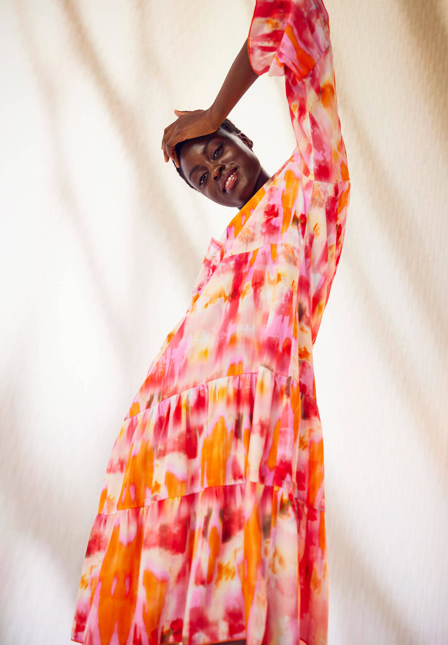 Wow, dieses nolie Kleid ist der absolute Hingucker! Im angesagten Tiger-Print mit pinkem Grund - total im Trend! Die goldfarbenen Akzente machen es besonders edel. Der V-Ausschnitt mit kleiner Rüsche ist mega feminin! Der Gummizug an der Taille betont deine Figur perfekt - schmeichelhaft für jede Silhouette! Die elastischen Ärmelabschlüsse sitzen super bequem! Perfekt für Partys, Dates oder besondere Anlässe! Siehst du darin einfach umwerfend aus! Die Qualität fühlt sich hochwertig an - kein billiger Stoff! In Größe L - passt perfekt! Ob mit High Heels oder Sneakers - immer stylisch! Macht sofort gute Laune - so ein Farbknaller! Ein Kleid das garantiert Komplimente regnet! Einfach anziehen und strahlen - du wirst es lieben!
