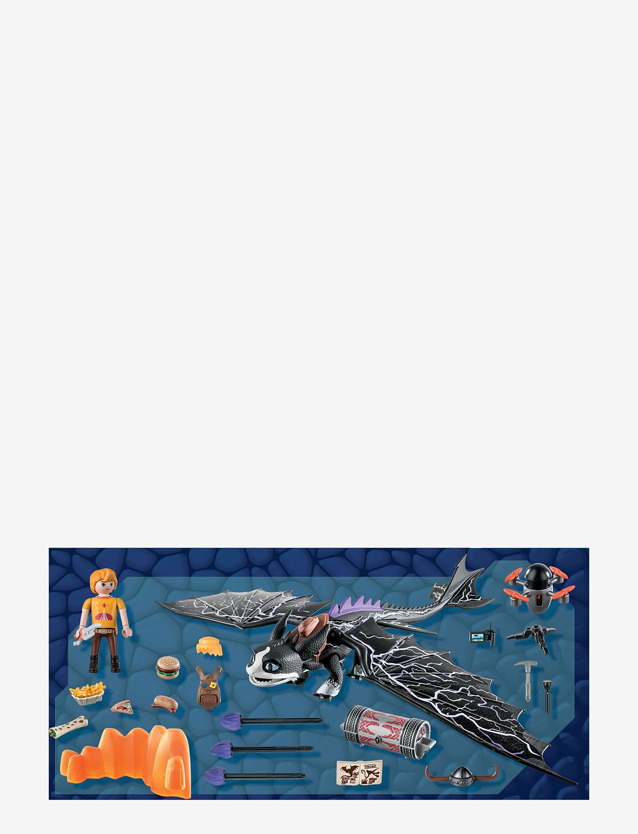 Achtung, Drachen-Fans! Dieses PLAYMOBIL Set bringt die Action aus 'Dragons: The Nine Realms' direkt in dein Kinderzimmer. Stell dir vor: Tom, der junge Abenteurer, und sein Drache Thunder erwachen zum Leben!\\n\\nThunder ist kein gewöhnlicher Spielzeug-Drache - er kann Plasmapfeile verschießen, hat bewegliche Beine, Flügel und Kopf, und seine Rückenkämme leuchten sogar! Mit dem integrierten Sattel kann Tom auf ihm reiten und gemeinsam erleben sie spannende Abenteuer.\\n\\nDas 39-teilige Set hat alles, was das Herz begehrt: Eine Spielfigur, den coolen Drachen, eine Drohne und 36 Zubehörteile. Made in Europe und mit abgerundeten Kanten perfekt für Kinderhände ab 4 Jahren.\\n\\nDie Qualität ist typisch PLAYMOBIL - robust und langlebig. Nur die Micro-Batterie für die Beleuchtung musst du separat besorgen. Mit der Aufbauanleitung geht's ganz fix, und dann kann der Spielspaß beginnen!\\n\\nOb alleine oder mit Freunden - mit Tom und Thunder wird es garantiert nicht langweilig. Perfekt für alle, die die Drachen-Serie lieben oder einfach nur cooles Spielzeug mögen!