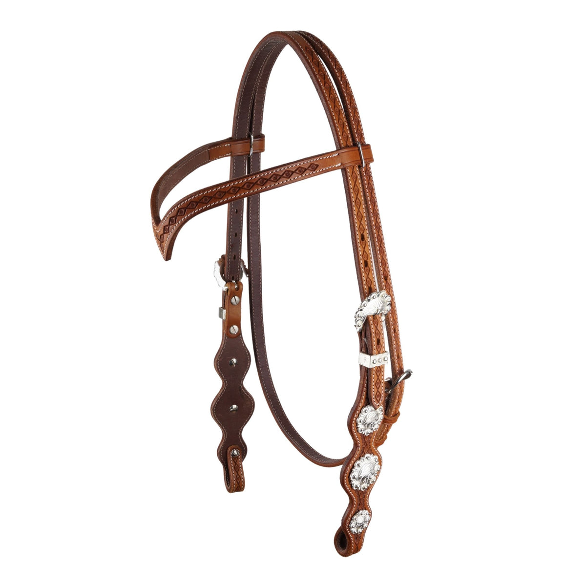 Pferdefreunde, diese Westerntrense von Horsemans Tack ist ein echter Hingucker! Zweifarbig in hell- und dunkelbraun mit floralen Mustern an Stirn- und Backenriemen. Beschläge aus rostfreiem Edelstahl für lange Haltbarkeit. Gebiss wird mit Lederriemen befestigt - traditionell und sicher. Größe Vollblut (Cob) passt für die meisten Pferde. Einfach regelmäßig mit Lederöl pflegen und sie bleibt lange schön. Einfach eine hochwertige Trense für anspruchsvolle Reiter!
