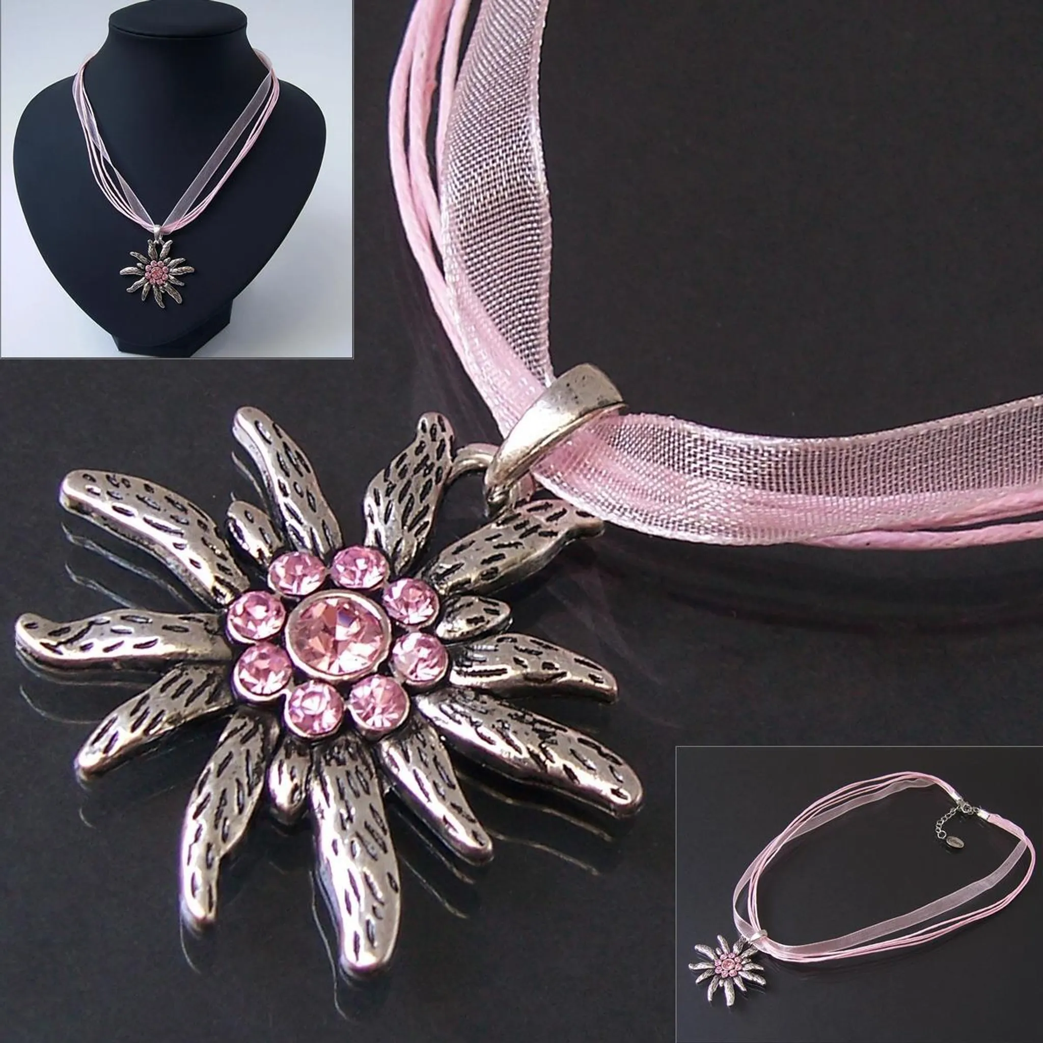 Das Kropfband aus Samt liegt angenehm weich am Hals. Der Edelweiss-Anhänger ist wunderschön mit Strass-Steinen besetzt und funkelt bei jedem Licht.