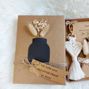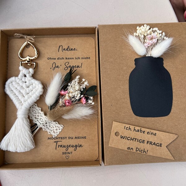 Hey, planst du eine Hochzeit? Dieses Trauzeugin-Geschenk-Set ist einfach perfekt, um deine Freundinnen zu fragen, ob sie deine Trauzeugin werden möchten! Im Set: eine süße Karte mit dem Spruch 'Möchtest du Meine Trauzeugin Sein?', einen wunderschönen Trockenblumenstrauß und einen handgefertigten Makramee-Schlüsselanhänger in Herzform. Alles aus hochwertiger Baumwolle und natürlichen Materialien, super langlebig und umweltfreundlich. Das herzförmige Design mit den zarten Blumen ist einfach hinreißend! Perfekt als bleibende Erinnerung an diesen besonderen Tag. Deine Freundinnen werden total begeistert sein von dieser persönlichen Aufmerksamkeit. Einfach überreichen und die Freude in ihren Augen sehen! Mach deine Hochzeitsvorbereitungen unvergesslich mit diesem einzigartigen Geschenk-Set. Perfekt für alle, die es persönlich und mit Herz mögen!