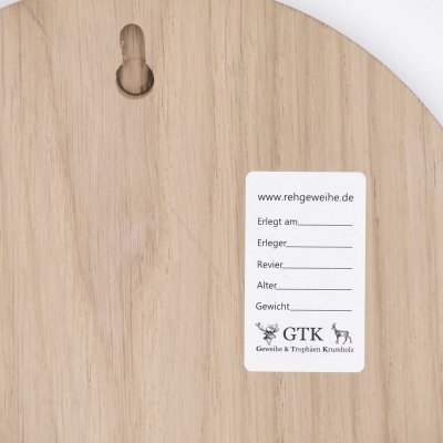 Jäger und Sammler, dieses Keilerschild ist ja mal richtig edel! Für die Präsentation deiner Wildschwein-Trophäen. 🐗\n\nAus hellem Eichenholz gefertigt, sieht es einfach klasse aus. Mit 13cm Aufsatzfläche und 14cm Außendurchmesser ist es die perfekte Größe für Keilerwaffen.\n\nIm Set sind 2 Aluminium-Eichenlaub Deckblätter dabei - super formbar und ideal zur Verzierung und Abdeckung der Trophäen.\n\nAuf der Rückseite findest du eine eingefräste Nut als Aufhänger und ein Etikett zum Eintragen aller wichtigen Daten:\n• Erlegt am\n• Erleger\n• Revier\n• Alter\n• Gewicht\n\nGTK steht seit über 30 Jahren für qualitativ hochwertige Jagdtrophäen und Zubehör. Das merkt man auch bei diesem Schild!\n\nFür die Jagdstube oder als Geschenk für Jagdfreunde - dieses Schild macht immer eine gute Figur.\n\nEinfach montieren und deine Trophäe perfekt in Szene setzen. Tradition und Qualität aus einer Hand! 🏹