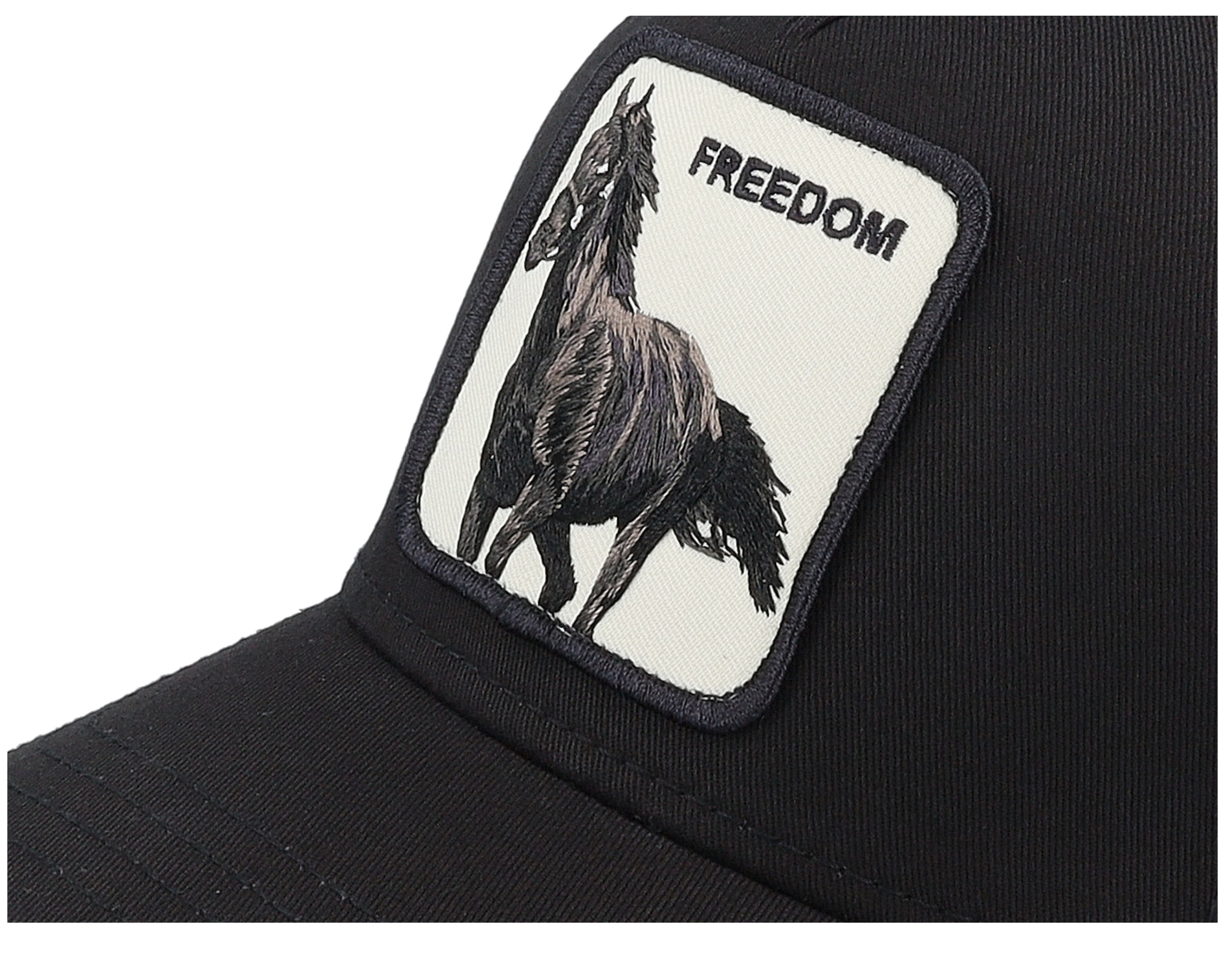 Coole Trucker Cap von Goorin Bros. - der Freedom Horse in schwarz ist einfach ein zeitloser Klassiker! Mit dem gebogenen Schirm und dem aufgestickten Frontpatch sieht sie einfach stylisch aus. Das beste: Der Rücken ist aus Netz, das sorgt für super Belüftung und macht die Kappe angenehm zu tragen.\\n\\nAus 57% Polyester und 43% Baumwolle gefertigt, ist sie robust und bequem zugleich. Als OneSize mit verstellbarem Verschluss passt sie praktisch jedem Kopf. Ob für den Alltag, Festival oder einfach so - mit dieser Goorin Bros. Cap machst du garantiert eine gute Figur.\\n\\nDie Qualität und Verarbeitung ist einfach erstklassig, wie man es von der Marke gewohnt ist. Der Style 101-2594-VOI in Void Schwarz ist ein echter Allrounder, der zu fast jedem Outfit passt. Einfach aufsetzen und losgehen - so einfach kann Style sein!