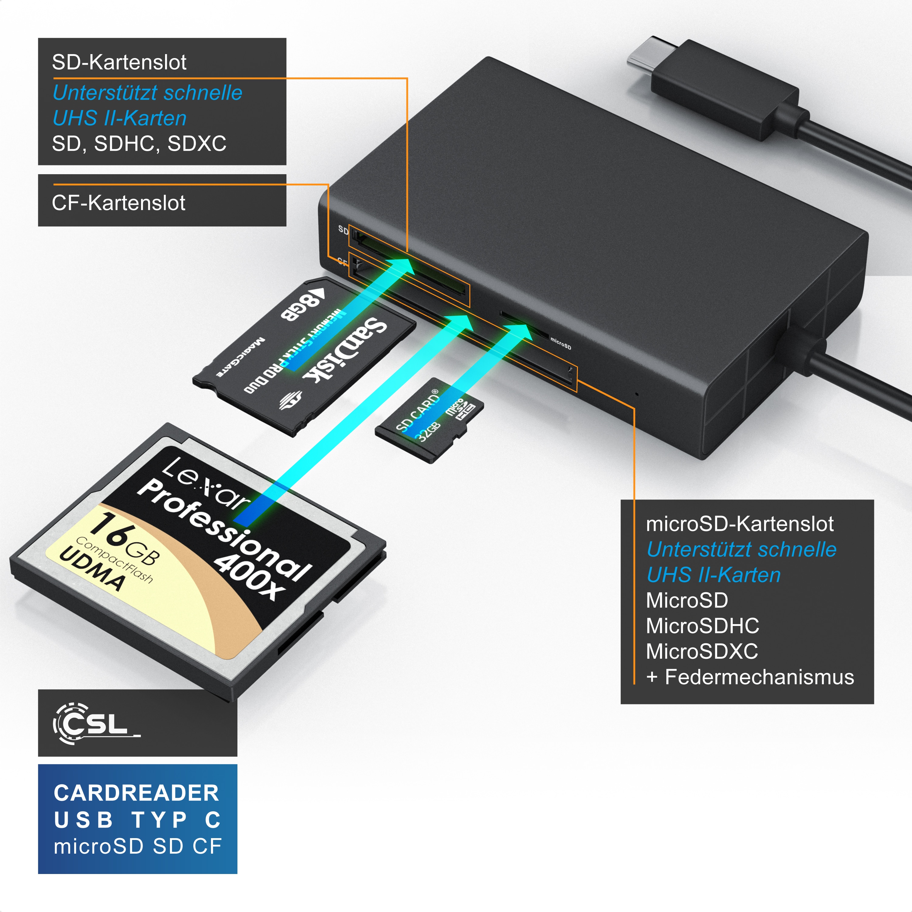 Der Alleskönner für alle deine Speicherkarten! Dieser USB-C Kartenleser liest einfach alles: SD, MicroSD und CompactFlash. Mit USB 3.0 Geschwindigkeit bis zu 5 Gbit/s - deine Fotos und Videos sind blitzschnell übertragen. Abwärtskompatibel mit USB 2.0 für ältere Geräte. Das 20cm integrierte Kabel ist super praktisch. Einfach anstecken und loslegen - keine Treiber nötig! Funktioniert mit Windows, Mac, Linux, Chrome OS, iPad und neuesten iPhones. Das edle Aluminium-Gehäuse sieht nicht nur gut aus, sondern ist auch robust. Hot-Swap fähig - Karten können im Betrieb gewechselt werden. Perfekt für Fotografen, Video-Produzenten oder alle, die häufig mit Speicherkarten arbeiten. Damit wird dein Workflow richtig effizient!
