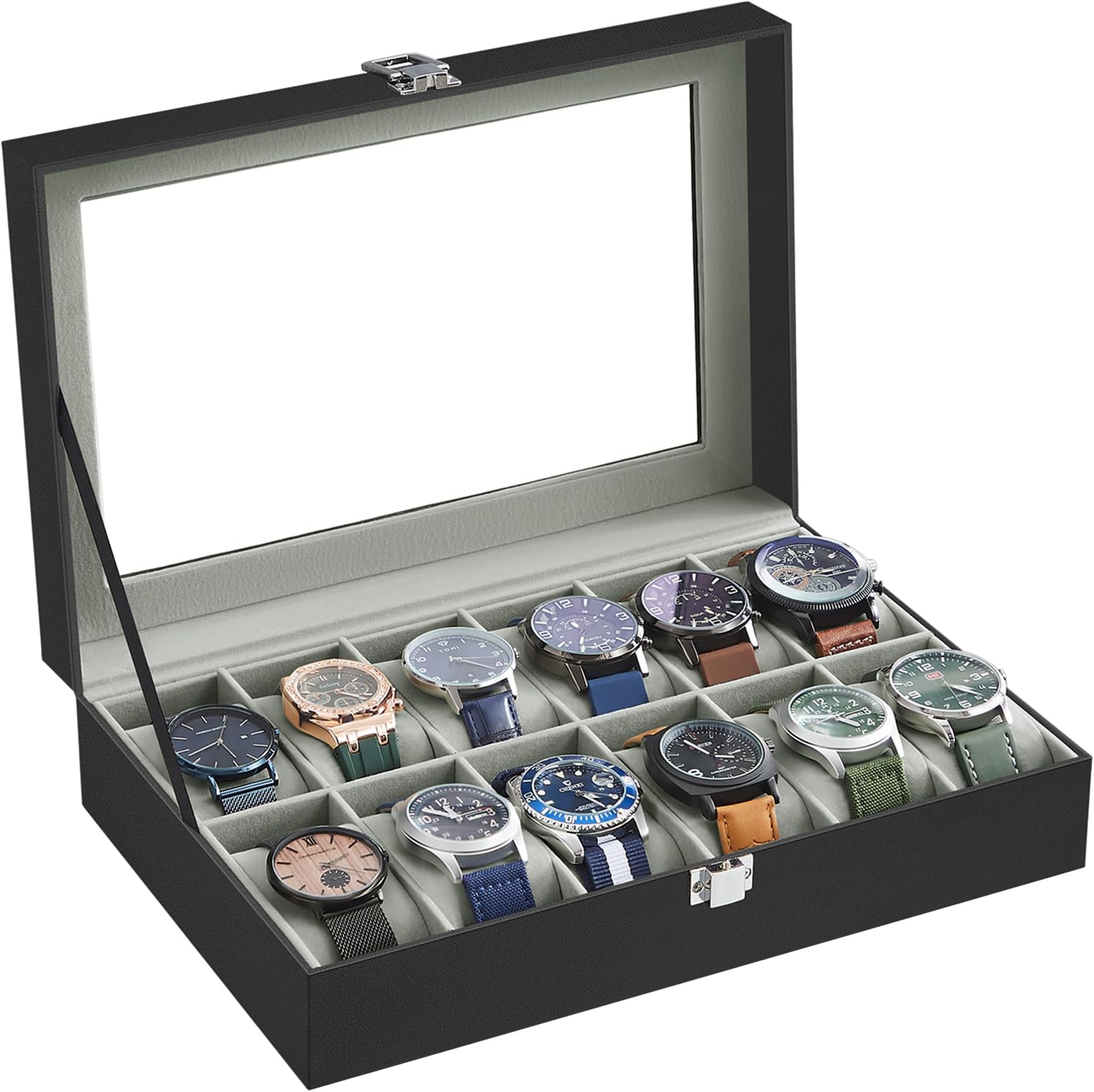 Mit 12x10x7cm kompakt aber geräumig genug für die meisten Armbanduhren. Gibt's in verschiedenen Farben - blau, schwarz, grau, gelb. Super für Reisen oder zur Aufbewahrung daheim.