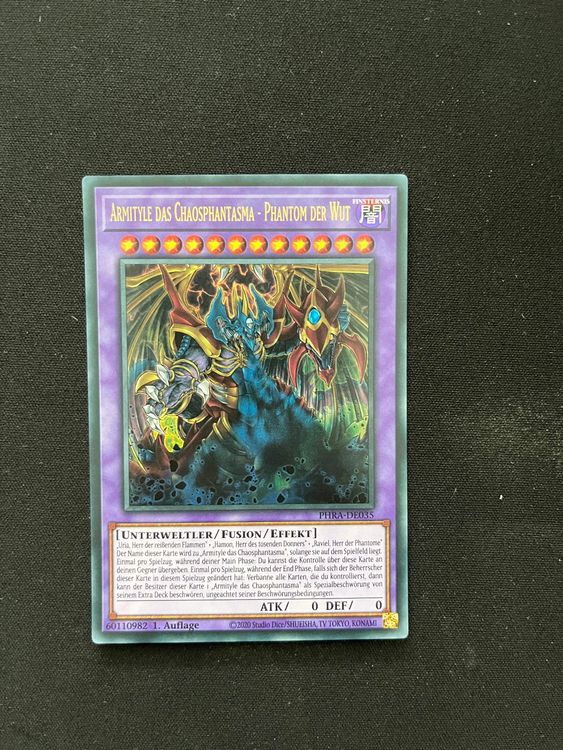 Alter, was für eine Karte! Armityle das Chaosphantasma aus dem Structure Deck: Sacred Beasts - Ultra Rare und 1. Auflage auf Deutsch! Ein absolutes Must-have für Sammler und Spieler! \\n\\nDas Effekt Fusionsmonster braucht Uria, Hamon UND Raviel für die Spezialbeschwörung - richtig stark! Kann nicht durch Kampf zerstört werden und kriegt in deinem Zug 10.000 ATK - krass oder? \\n\\nIm Lieferumfang ist sogar ein RC-Fieldcenter für Turniere dabei - super praktisch fürs Spielfeld! Karte kommt in Near Mint Zustand, sicher verpackt gegen Transportschäden. \\n\\nOffizielles Konami-Lizenzprodukt, nachhaltig verpackt. Seit 2018 im Kartenhandel - da weiß man, was man kriegt! Einfach ein Traum für jeden Yugioh-Fan!