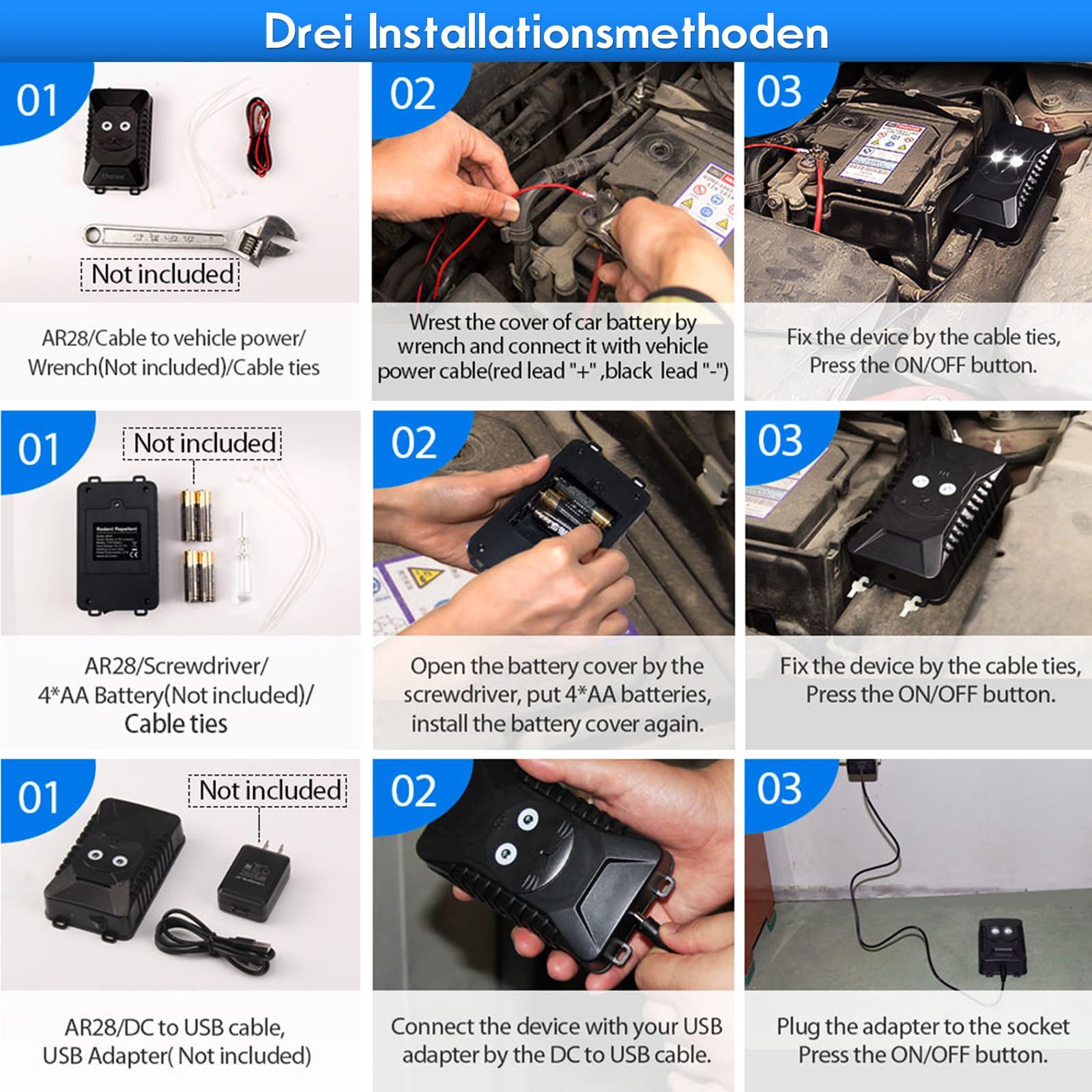 Schluss mit zerbissenen Kabeln im Auto! Der ADOGO Marderschreck vertreibt lästige Marder und Nagetiere zuverlässig aus deinem Motorraum. Das Gerät kombiniert Ultraschallwellen (18-36 kHz - für Menschen kaum hörbar) mit blinkendem LED-Licht, was Marder absolut nicht mögen. Der clevere Vibrationssensor schaltet das Gerät automatisch ein, wenn du das Auto abstellst - nach 2 Minuten geht's los! Du kannst es mit 4 AA-Batterien, per USB oder Autoanschluss betreiben. Die Reichweite beträgt ca. 90m², also perfekt für Garage, Dachboden oder Gartenhaus. Einfach mit den beiliegenden Kabelbindern befestigen - kein Werkzeug nötig. Temperaturbeständig von -25°C bis +65°C, hält also auch harte Winter aus. Schütz dein Auto vor teuren Reparaturen - mit diesem cleveren Helferchen!
