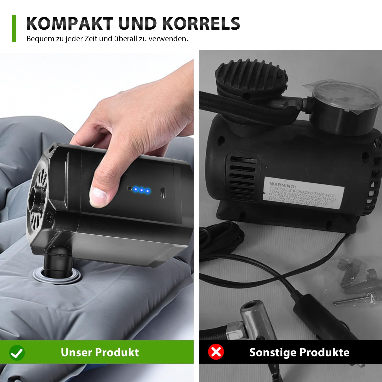 Mega praktisch, diese SUPPOU Luftpumpe! Mit 5200 mAh Akku kabellos und überall einsetzbar – ob Camping, Strand oder zu Hause. Bläst und saugt ab mit 400 l/min, also super schnell. Vier Düsen für alles Mögliche: Luftmatratzen, Schwimmringe, Schlauchboote. Der Bildschirm zeigt den Akku an, und mit USB lädst du sie easy auf. Überhitzungsschutz sorgt für Sicherheit, und das kompakte Design passt in jeden Rucksack. Einfach einschalten und in Sekunden ist alles aufgepumpt. Perfekt für Outdoor-Abenteuer!