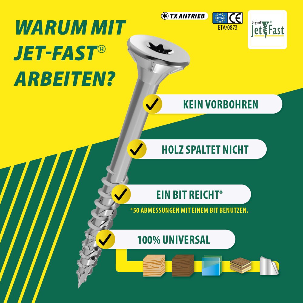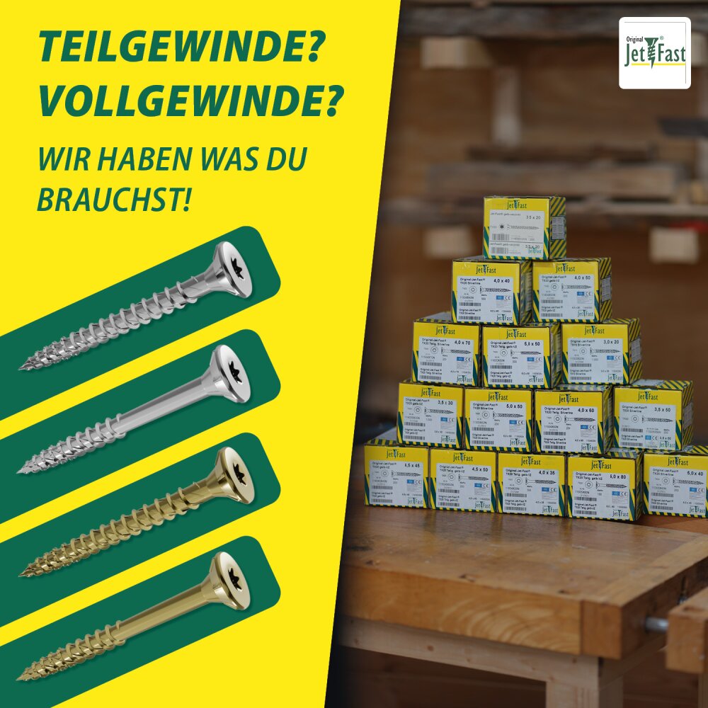 Für alle Heimwerker: Diese Jet-Fast Schrauben sind die Alleskönner für Holzverbindungen! Mit 5,0x80mm Größe und TX25 Antrieb - perfekt für stabile Verbindungen. Teilgewinde für besseren Halt in Holzwerkstoffen. Besonderheiten: DUO-SENKRIPPENKOPF für saubere, glatte Versenkung ohne auszufasern. MEHRFACHGEWINDE für leichtes Einschrauben und schnelles Arbeiten. SELBSTBOHRENDE SPITZE für splitterfreies Eindringen - kein Vorbohren nötig! Aus Pro Inox Material für lange Haltbarkeit. Inhalt: 100 Stück - genug für mehrere Projekte. Ideal für Möbelbau, Terrassen, Holzverkleidungen. Die optimale Gewindegeometrie sorgt für besten Halt in allen Holzarten. TX-Aufnahme für optimale Kraftübertragung ohne Abrutschen. Profi-Qualität für Heimwerker - einfach besser schrauben!