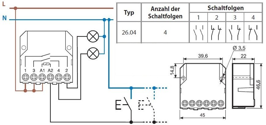 • Finder Stromstoßschalter 12 VAC - Unterputz Montage Mit 2 Schließern Und 4 Schaltfolgen