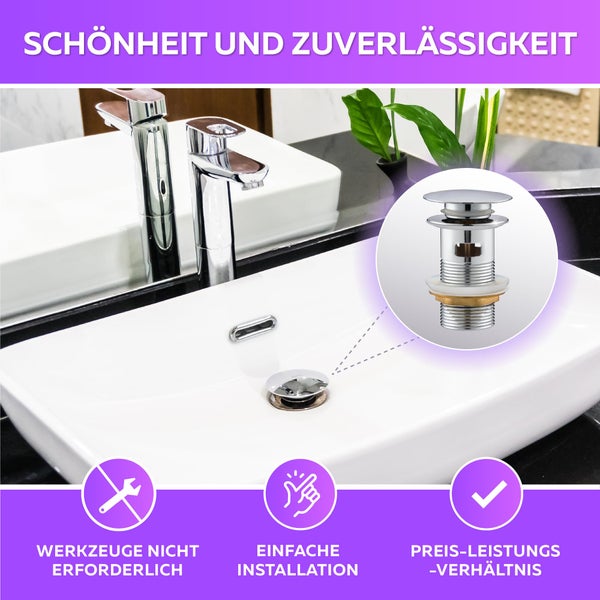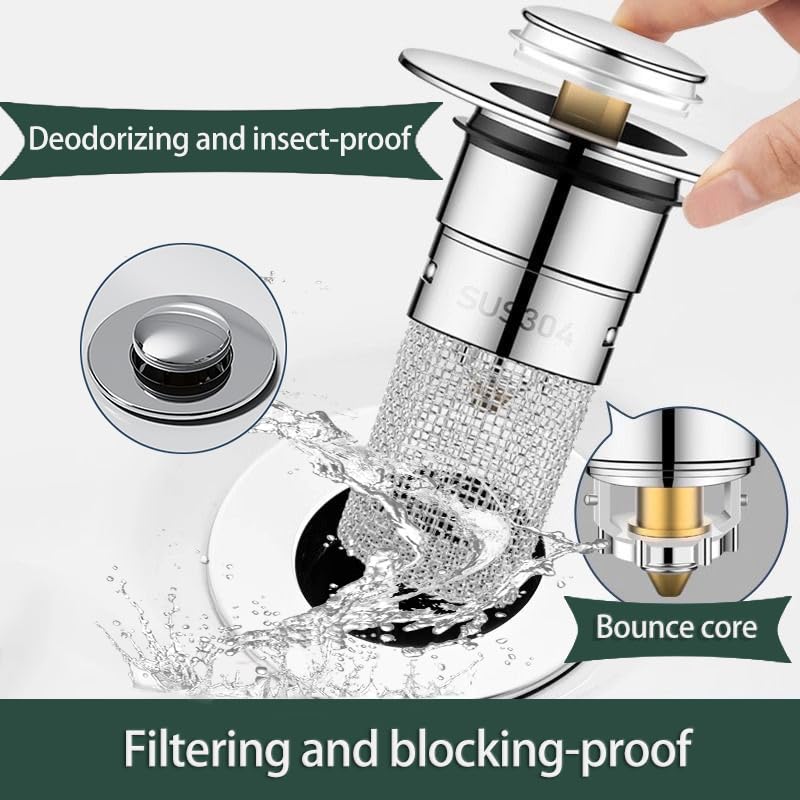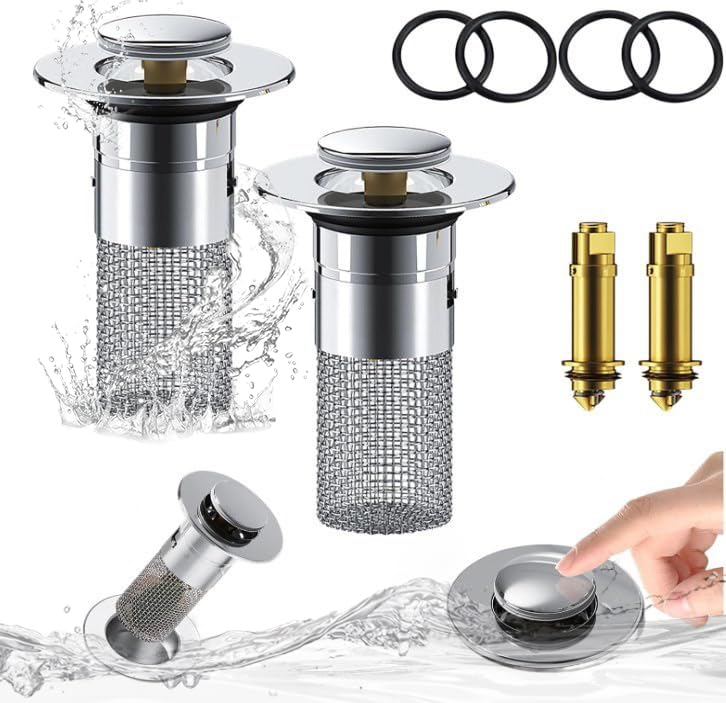 Praktisch und hygienisch! Diese 2 Edelstahl-Stöpsel mit Pop-Up Funktion machen jedes Waschbecken besser. Perfekt für Löcher von 34-40 mm Durchmesser - für Bad, Küche oder Balkon. Einfach drücken zum Öffnen und Schließen - kein Bücken und Drehen mehr nötig! Das Sieb fängt Haare und Schmutz ab und verhindert so Verstopfungen. Aus hochwertigem 304 Edelstahl und Messing, rostfrei und langlebig. Einfach ohne Werkzeug zu installieren - alten Stöpsel raus, neuen rein. Damit läuft das Wasser optimal ab und dein Waschbecken bleibt sauber - so einfach kann praktisch sein!