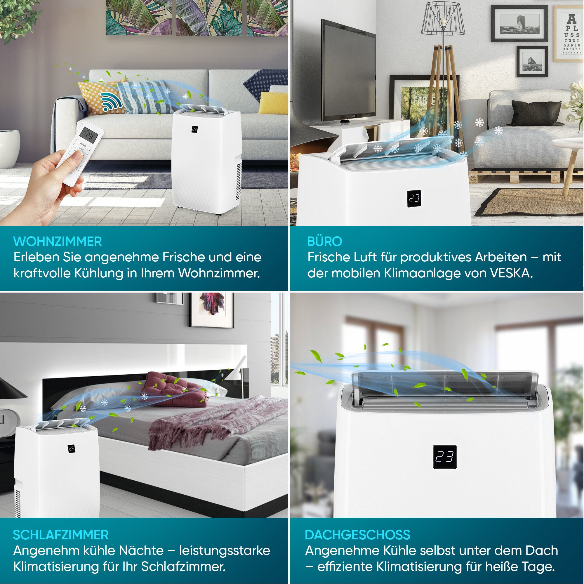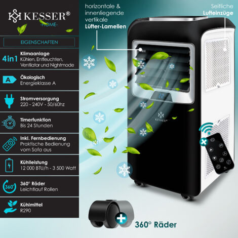 Diese VESKA mobile Klimaanlage macht heiße Sommertage erträglich! Mit 12000 BTU Kühlleistung perfekt für Räume bis 40m². Das 4in1 Multitalent kann kühlen, entfeuchten, ventilieren und hat einen leisen Schlafmodus. Per App, Fernbedienung oder Touch-Display steuerbar - total flexibel! Mit dem umweltfreundlichen Kältemittel R290 schonst du die Umwelt bei hoher Energieeffizienz. Die 360° Leichtlaufrollen machen das Verschieben zum Kinderspiel. Der ausziehbare Abluftschlauch (bis 1,5m) gibt dir Montagefreiheit. Besonders leise im Nachtmodus - perfekt für erholsamen Schlaf. Temperaturen von 16°C bis 32°C einstellbar - für jedes Wohlfühlklima. Der 24h-Timer sorgt für automatisches An- und Abschalten. Wenn dir also die Hitze zu schaffen macht und du flexible Kühlung brauchst, ist diese Klimaanlage genau das Richtige. Einfach ein komfortabler Begleiter für den Sommer!