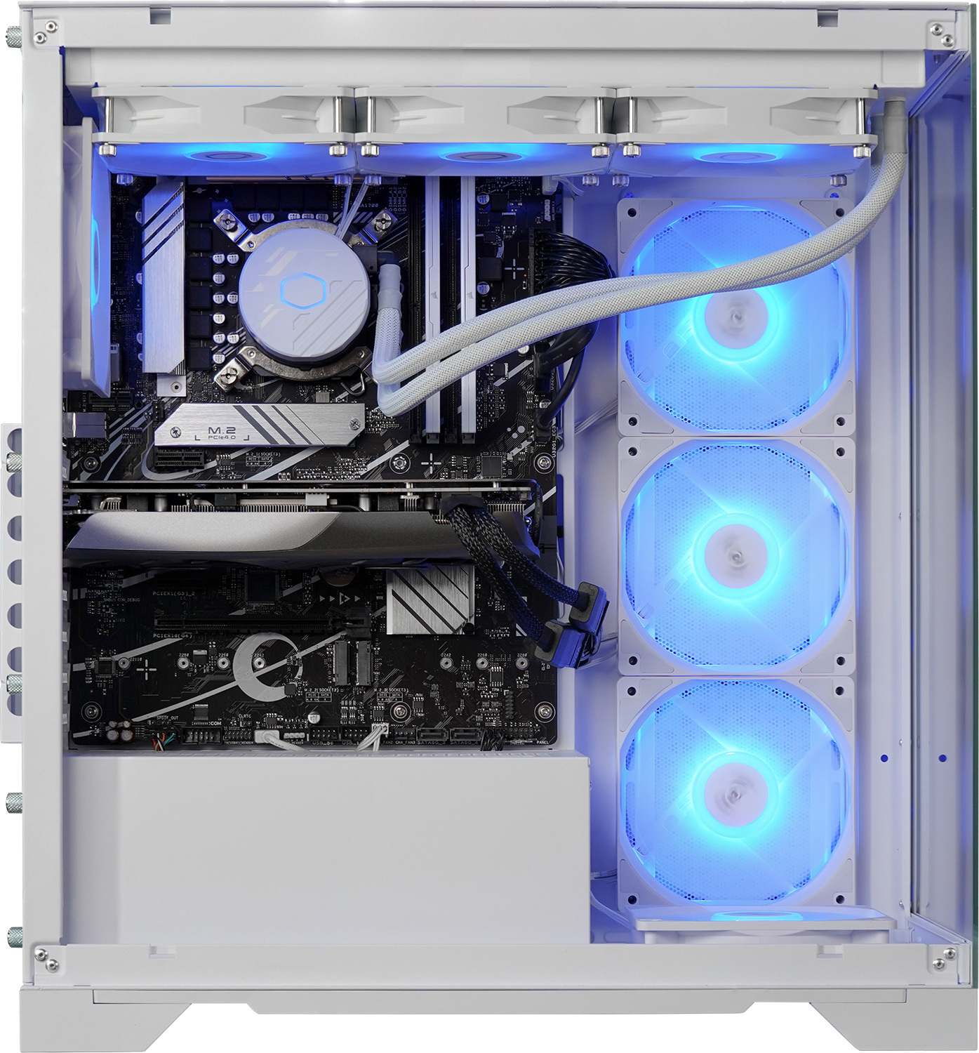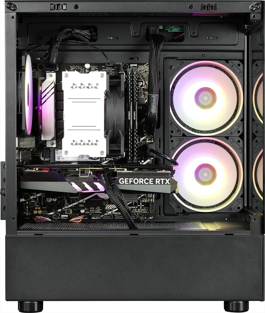 Drei Zusatzlüfter sorgen für optimalen Airflow, die Beleuchtung ist per Software anpassbar. Kratzfeste Glasfront und -seite geben den Blick auf die Hardware frei. Vorinstalliert mit werbefreiem Windows 11 - sofort startbereit.
