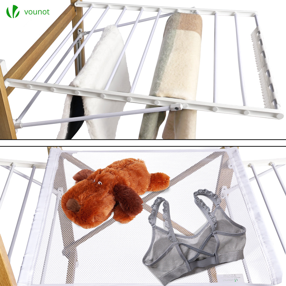 Boah, endlich mal ein Wäscheständer der was taugt! Der VOUNOT Flügelwäscheständer hat satte 25 Meter Trockenlänge - da passt die ganze Wäsche einer Familie drauf! Mit den ausklappbaren Flügeln kannst du sogar lange Hosen und Bettwäsche super aufhängen. Die 20 integrierten Wäscheklammern sind perfekt für Socken und Unterwäsche - nichts geht mehr verloren! Wenn du wenig Platz hast: Einfach zusammenklappen und er ist nur noch 9 cm schmal. Super für kleine Badezimmer, Balkone oder Waschküchen. Das Metallgestell ist richtig stabil und hält bis zu 20 kg aus - da kannst du auch nasse Handtücher draufhängen ohne dass er wackelt. Die rutschfesten Kunststofffüße schützen deine Böden. Aufgebaut misst er 175x92x106 cm, zusammengeklappt nur 93x60x9 cm. Perfekt für drinnen und draußen! Ob in der Wohnung, im Garten oder auf dem Balkon - dieser Wäscheständer ist ein echter Alleskönner! Einfach aufklappen, Wäsche drauf und fertig - so einfach kann Wäschetrocknen sein! Damit sparst du nicht nur Platz, sondern hast auch alles an einem Ort organisiert.