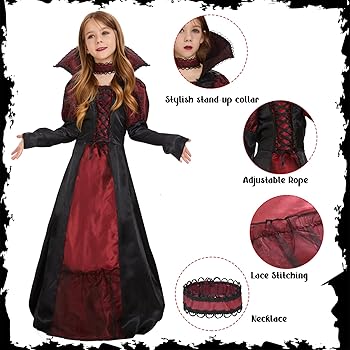 Wie cool ist denn dieses Vampir-Kostüm! Deine Tochter wird der absolute Star auf jeder Halloween-Party! Das Set enthält alles, was man braucht: Ein schickes Vampir-Kleid, eine elegante Rosen-Halskette, eine geheimnisvolle Maske und zwei gruselige Narben-Tattoos. Aus weichem, atmungsaktivem Polyester - bequem zu tragen und haut freundlich! Das Retro-Design mit Stehkragen und fließenden Glockenärmeln sieht einfach mega aus! In 5 verschiedenen Größen für Mädchen von 120-160 cm - da findet sich garantiert die passende Größe! Perfekt nicht nur für Halloween, sondern auch für Karneval, Mottopartys oder Schulfeiern. Die Qualität ist super - nichts reißt oder geht kaputt! Dein Kind fühlt sich wie eine echte Grusel-Prinzessin! Einfach anziehen, Accessoires dazu - und schon ist die Verwandlung komplett! Das perfekte Geschenk für kleine Vampir-Fans! Einfach umwerfend schön und gruselig zugleich!