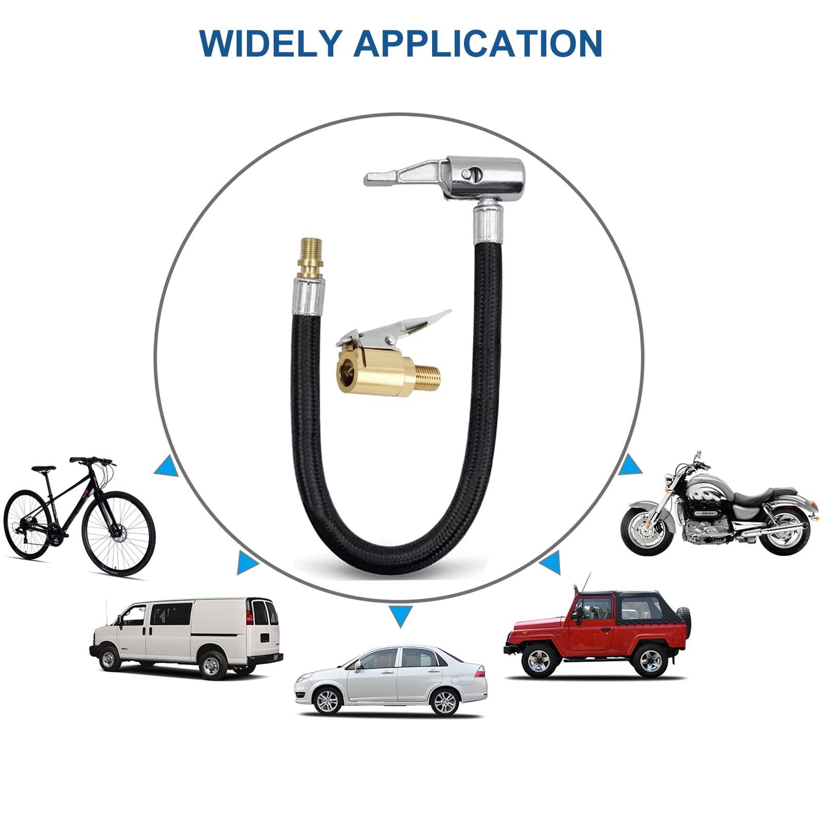 Endlich einfach Reifen aufpumpen - auch an schwer erreichbaren Ventilen! Dieses praktische Set mit 20cm langem Reifenfüllschlauch und zwei robusten Autoventil-Adaptern macht's möglich. Aus verchromtem Messing gefertigt, rostfrei und langlebig. Perfekt für Werkstatt und Heimgebrauch. Passt an fast alle Luftkompressoren und Pumpen. Einfache Montage - einfach aufschrauben und lospumpen! Die spezielle Dichtung verhindert Luftverlust während des Aufpumpens. Kompatibel mit Fahrrädern, Motorrädern, Autos, Bussen und sogar LKWs. Nie wieder mit verkrampften Händen versuchen, an das Ventil zu kommen! Spare Zeit und Nerven bei der Reifenwartung. Ein echter Allrounder für jeden Fahrzeugbesitzer!