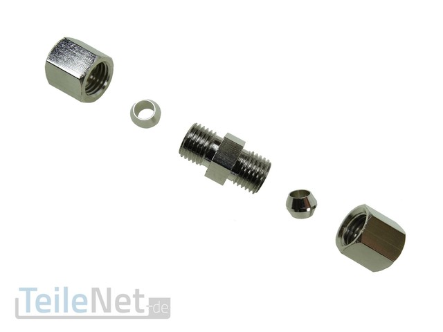 Die Überwurfschrauben haben M10x1 Gewinde mit 11er Schlüsselweite und 16,7mm Gesamtlänge. Die Adapter mit 2x M10x1 Gewinde, 14er Schlüsselweite und 24mm Länge. Alles für Bördel F und 4,75mm Leitungsdurchmesser.