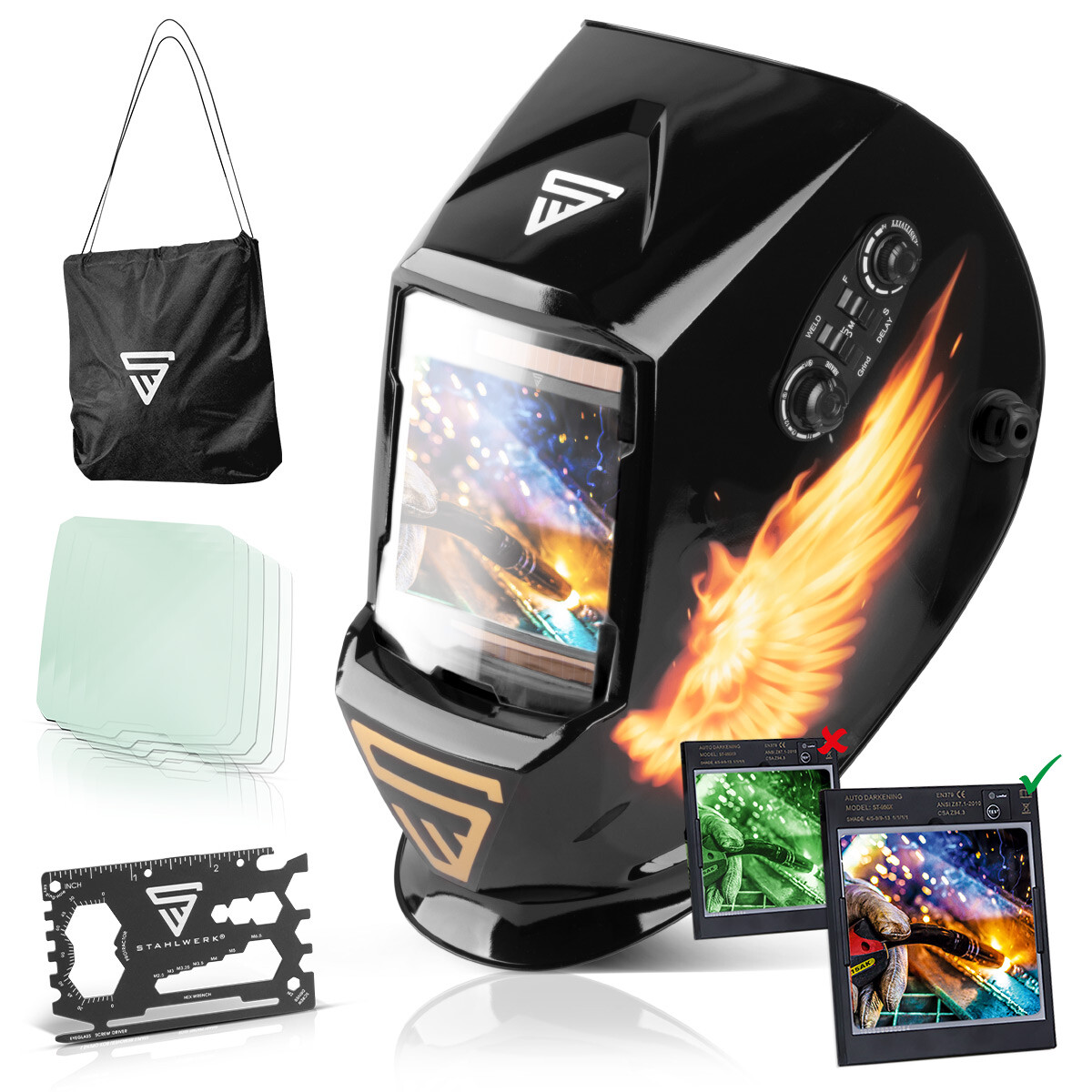Schweißer, dieser automatische Schweißhelm macht eure Arbeit so viel angenehmer! Der große Sichtbereich (100x93mm) gibt dir freie Sicht, und die automatische Verdunkelung (DIN5-13) schützt deine Augen blitzschnell in 1/10000 Sekunden. Einstellbare Empfindlichkeit und Verzögerungszeit (0,1-0,8s) lassen dich den Helm perfekt an deine Arbeitsweise anpassen. Mit Solar- und Batteriebetrieb (CR2450) bist du immer auf der sicheren Seite. Der leichte PP-Material macht das Tragen angenehm, und das verstellbare Kopfband sitzt bei jeder Kopfgröße perfekt. Ob Schweißen, Schleifen oder Schneiden - mit den 4 Sensoren und UV-Schutz (DIN16) bist du optimal geschützt. Selbsttest und Unterspannungsalarm geben zusätzliche Sicherheit. Einfach den Helm aufsetzen und konzentriert arbeiten - deine Augen werden's dir danken!