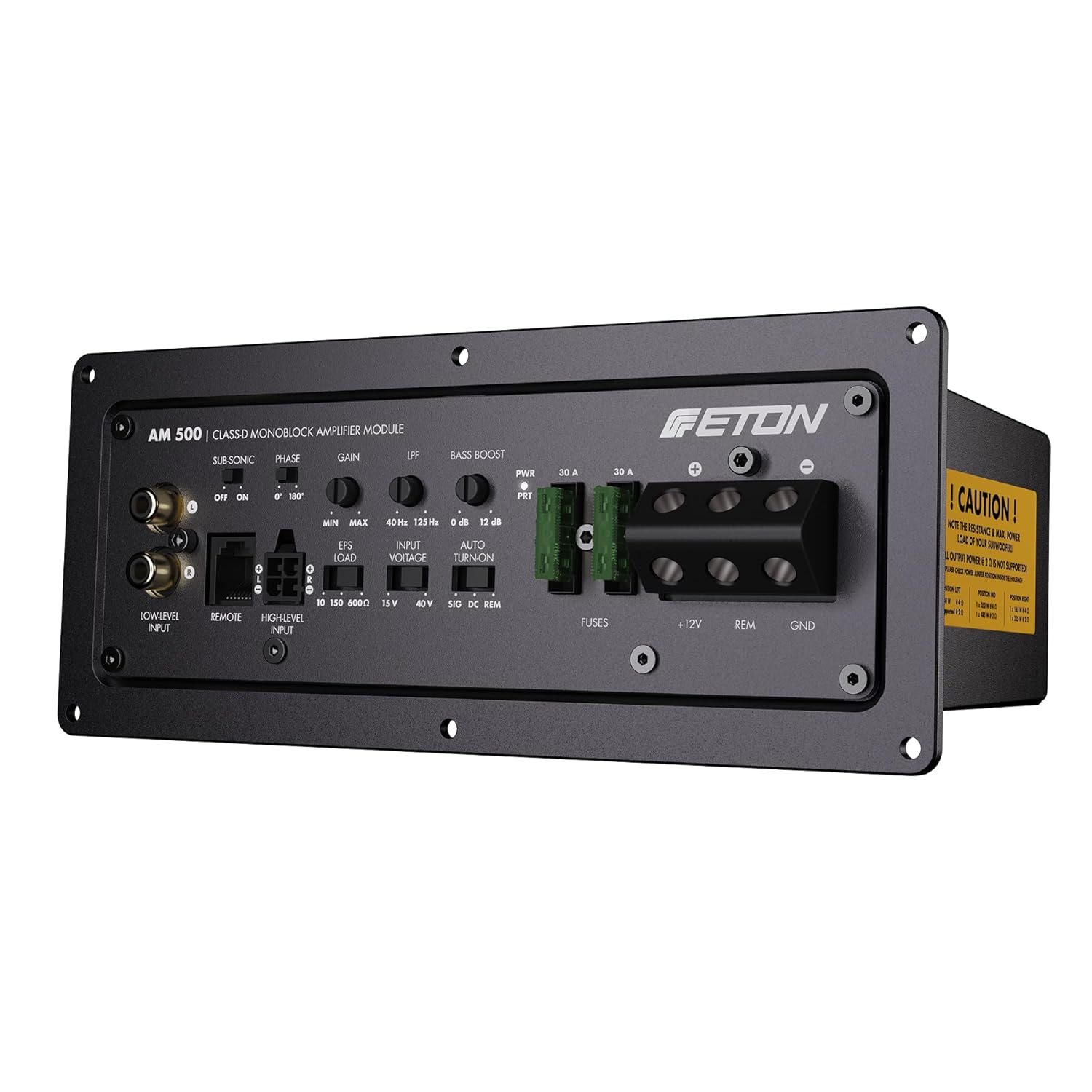 Bass satt für deinen Selbstbau-Subwoofer! Das ETON AM 500 ist das komplette Verstärker-Modul für Profi-Sound. 540W RMS bei 4 Ohm - da wackeln die Wände! Class-D Technologie - effizient und platzsparend. Im luftdichten Aluminiumgehäuse - robust und gut gekühlt. Mit 3-stufigem Leistungslimiter - perfekt auf deinen Subwoofer abstimmbar. Alles dabei: Tiefpassfilter 40-125Hz, Subsonicfilter 25Hz, Bass-Boost bis 12dB, Phasenumschaltung. High- und Low-Level Eingänge - passt an jede Anlage. Auto Turn-On Funktion - startet automatisch mit der Musik. Maße: 206x85x98mm - passt in die meisten Gehäuse. Inklusive Pegelfernbedienung, Anschlussstecker und Montagematerial. Einfach einbauen, verkabeln, und ab geht der Bass! Deine DIY-Subwoofer Träume werden wahr.