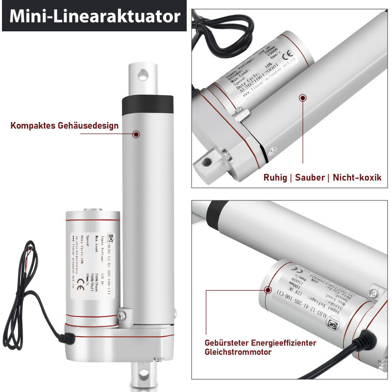 Brauchst du zuverlässige Bewegungstechnik? Der Einfeben Linearmotor mit 12V DC und 1500N Kraft ist dein Allrounder für viele Projekte! Ob für höhenverstellbare Tische, Massagesessel, TV-Lifter oder Toröffner - dieser Motor bewegt bis zu 337 lbs (153kg) sicher und präzise. Mit 300mm Hubweg und nur 5.7mm/s Geschwindigkeit arbeitet er super leise (<50dB). Aus Aluminiumlegierung, mit integrierten Endschaltern und Metallgetriebe. Einfache Installation: Roter Draht an Plus, schwarzer an Minus - schon geht's los! Perfekt für Heimwerker, Industrie oder Landwirtschaft. Temperaturbereich von -26°C bis +65°C - hält also einiges aus. Übrigens: Nicht wasserdicht, also besser nicht im Regen stehen lassen!