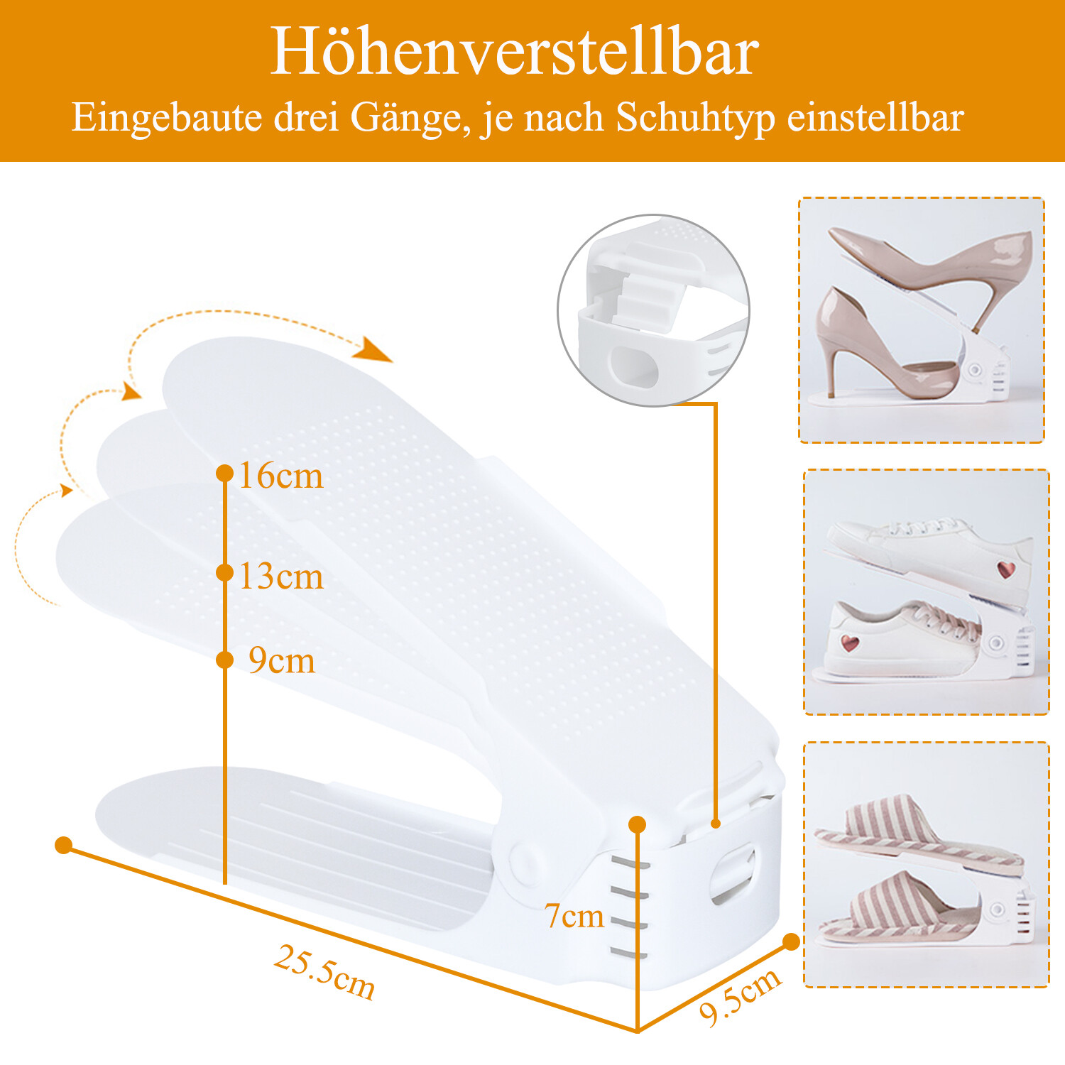Schluss mit dem Schuhchaos im Flur! Dieses praktische Schuhregal-Set bringt Ordnung in deinen Eingangsbereich. Mit dem cleveren Doppelstock-Design kannst du zwei Paar Schuhe übereinander stapeln - so sparst du jede Menge Platz! Die Höhe ist 3-stufig verstellbar, sodass du alles von flachen Sneakern bis zu High Heels unterbringst. Aus robustem PET-Material gebaut, hält der Organizer auch bei täglicher Nutzung problemlos stand. Mit 25x11,5x9cm passt er super in jeden Schrank oder direkt an die Wand im Flur. Endlich alle Schuhe ordentlich aufbewahrt und immer griffbereit - so macht Aufräumen Spaß!
