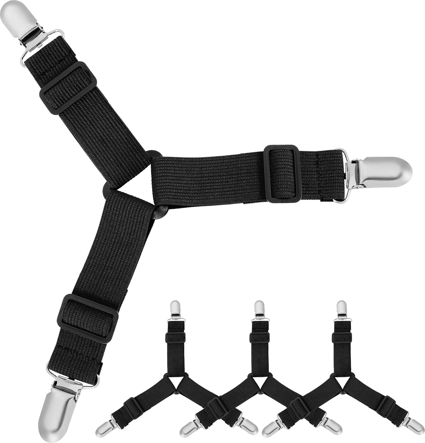 Schluss mit verrutschten Laken! Diese praktischen Bettlakenspanner sorgen dafür, dass deine Bettwäsche den ganzen Nacht perfekt sitzt.\n\nIm 4er-Set bekommst du genug Halter für alle vier Ecken deines Bettes. Die Spannklammern sind innen gepolstert, damit deine teuren Laken nicht beschädigt werden. Die rostfreien Edelstahl-Clips sind langlebig und hinterlassen keine Flecken.\n\nDas durchdachte Dreiecks-Design sorgt für gleichmäßige Spannung und festen Halt. Die verstellbaren Gummibänder passen sich jeder Matratzengröße an - von Einzelbett bis Kingsize (86cm bis 279cm einstellbar).\n\nDie Anwendung ist denkbar einfach: Spannklammer öffnen, Laken festklemmen, Klemme zudrücken, Gummiband straff ziehen - fertig! Dein Laken bleibt jetzt genau da, wo es sein soll.\n\nAber die Halter können mehr als nur Bettlaken fixieren! Perfekt auch für Sofabezüge, übergroße Tischdecken, Bügelbrett-Abdeckungen oder andere textile Herausforderungen.\n\nMit dem praktischen Hebelverschluss geht das Anbringen ratzfatz. Die Halter sind aus langlebigem Nylon-Kunststoff mit robustem Beißmechanismus gefertigt.\n\nMaße: 11x16x4cm, Farbe: Schwarz. Ein unverzichtbares Tool für jeden Haushalt, der Wert auf ein ordentliches und gemütliches Bett legt.\n\nAuch ein super Geschenk für alle, die sich über ständig verrutschende Laken ärgern. Endlich durchschlafen ohne morgens das Laken wieder zurechtzuzupfen!