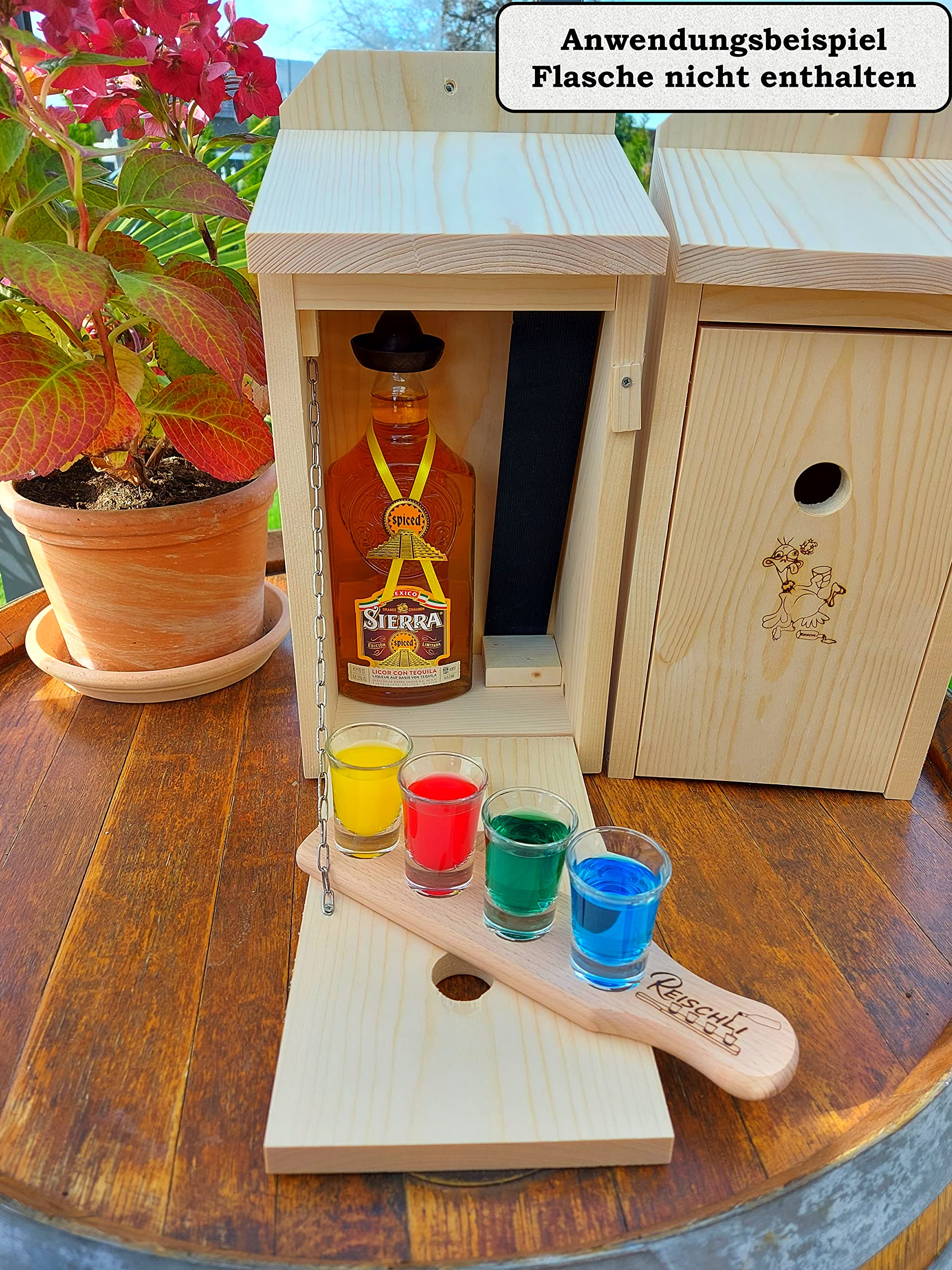 Das ist ja mal eine geniale Idee! Diese Vogelhaus-Minibar aus österreichischem Kiefernholz ist perfekt für echte Schnaps-Fans. Inklusive 4 Schnapsgläsern und herausnehmbarem Schnapsbrett - alles kommt in einer schicken Geschenkbox. Perfekt für Geburtstage, Vatertag oder einfach so. Das Holz ist geölt und imprägniert, hält also auch im Garten. Dein Papa, Opa oder Kumpel wird aus dem Staunen nicht mehr rauskommen! Ein Geschenk, das garantiert für Lacher sorgt und praktisch ist obendrauf.