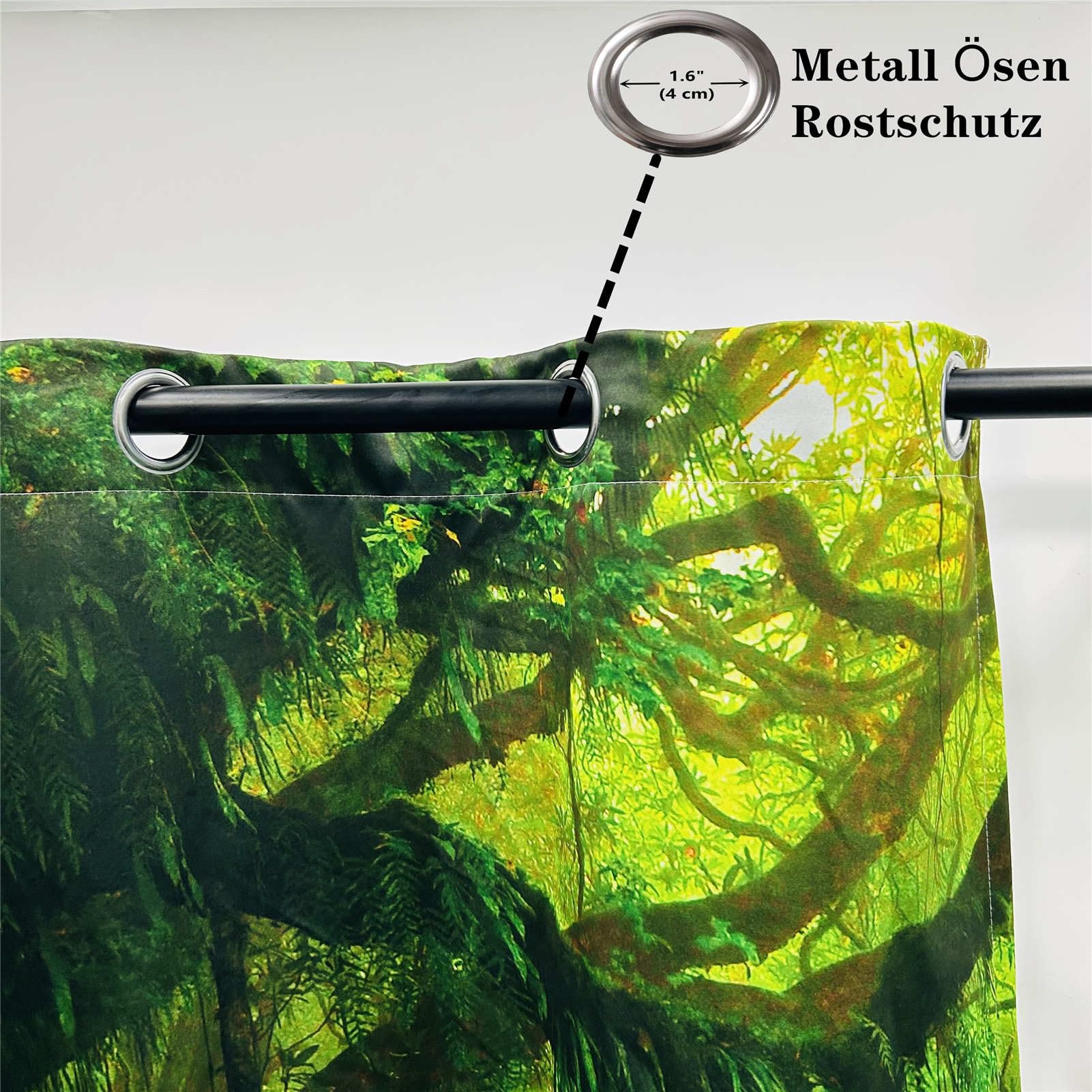 Schlafzimmer, Kinderzimmer, Wohnzimmer - diese Dschungel-Vorhänge machen jeden Raum gemütlich! Das 2er-Set mit je 225x140cm (gesamt 225x280cm) verdunkelt deinen Raum perfekt und das coole Sternenhimmel-Wald-Design sorgt für echte Wohlfühl-Atmosphäre. \\n\\nAus 240g/m² Polyester gefertigt, sind die Vorhänge reißfest, weich und knitterarm. Die 3D-Drucke leuchten in kräftigen Farben und die Dreifach-Webtechnik mit schwarzer Mittelschicht blockiert Licht effektiv. Plus: Sie dämmen auch Geräusche! \\n\\nDie 4cm Ösen passen auf die meisten Gardinenstangen. Einfach in der Maschine bei 30° waschen - schon sehen sie wieder aus wie neu. Egal ob für Jungen, Mädchen oder Erwachsene - diese Vorhänge sind ein echter Hingucker und praktisch obendrauf!