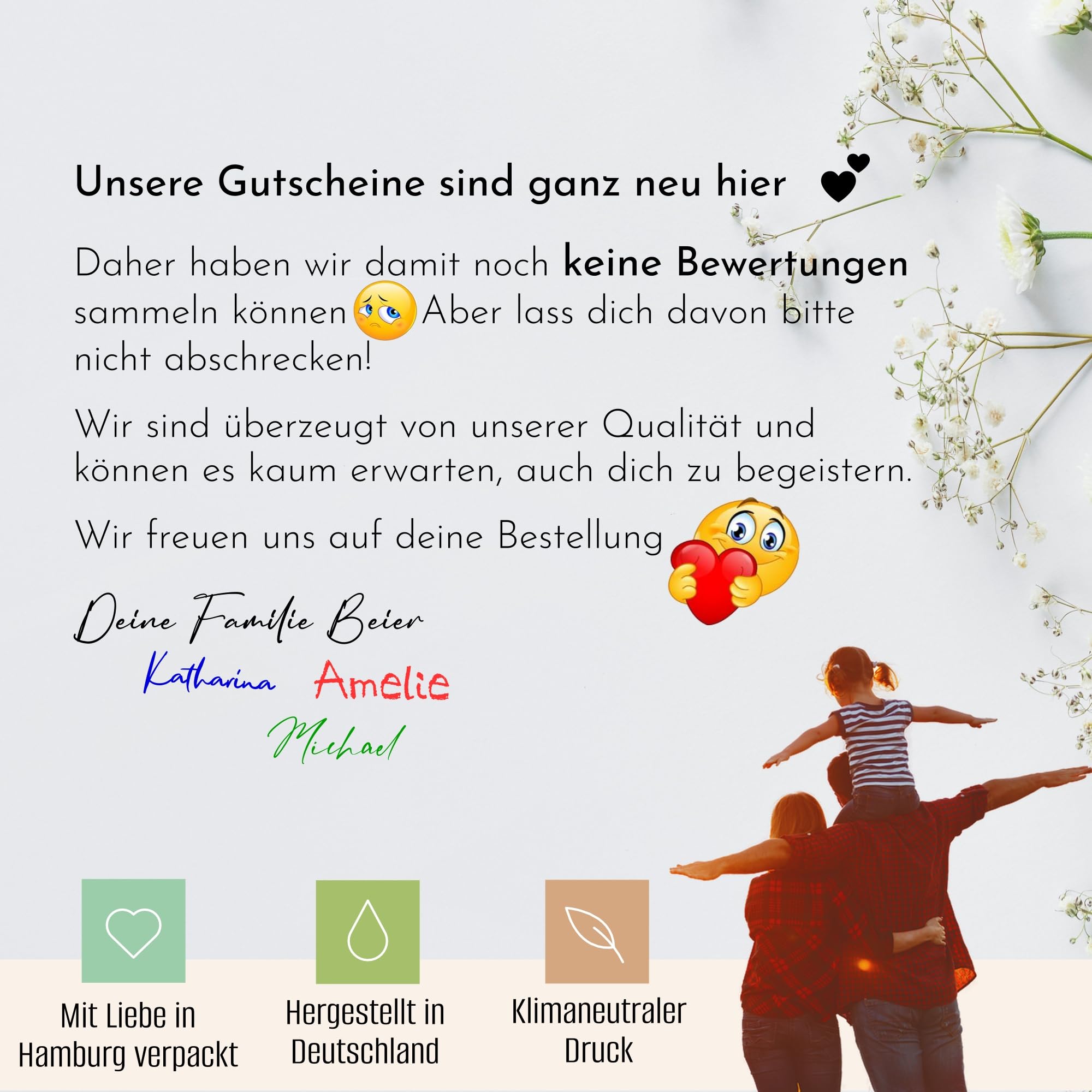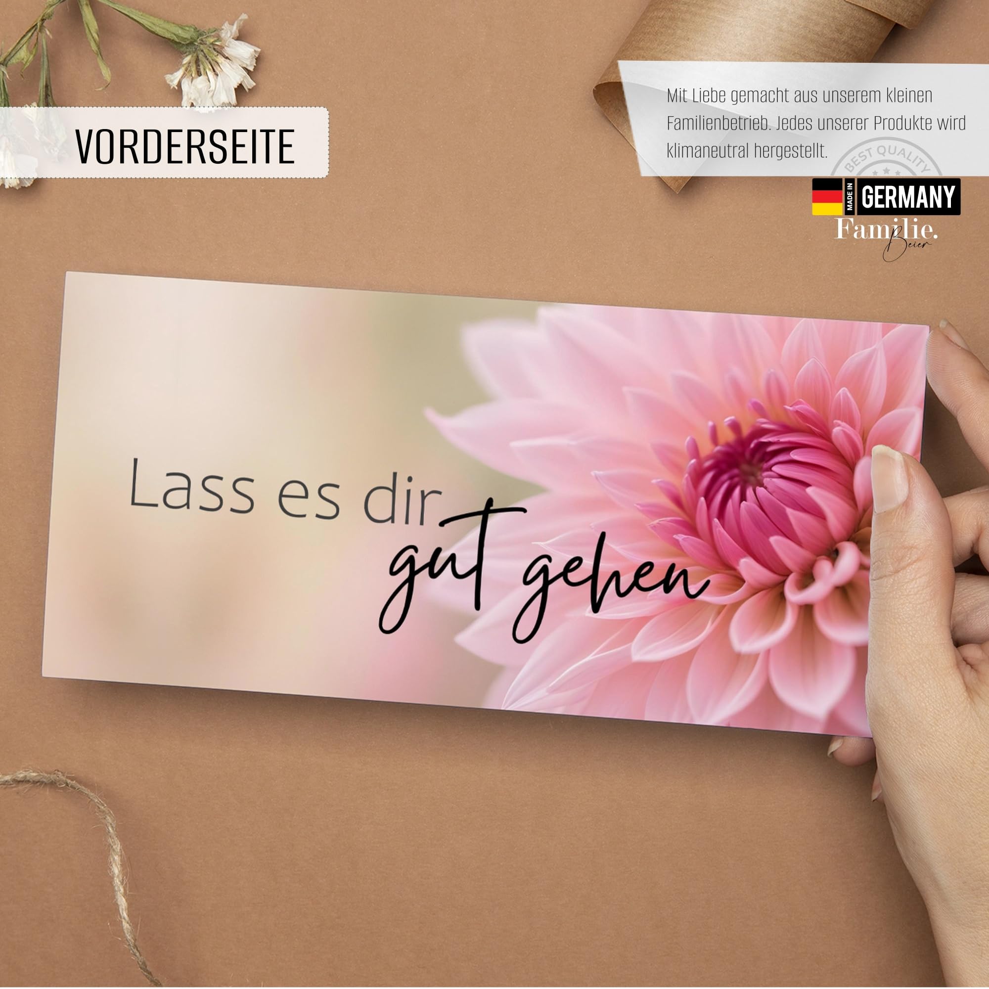 40 hochwertige Gutscheinkarten im praktischen DIN Lang Format (21 x 9,9 cm) - perfekt für dein Business! Gedruckt auf cremefarbenem 300g-Papier fühlen sich die Karten richtig wertig an und machen einen professionellen Eindruck. Ob Friseursalon, Massage-Praxis, Kosmetikstudio, Café oder Restaurant - diese neutral gestalteten Vorlagen passen für jeden Service. Einfach den Betrag und deine Unterschrift eintragen, schon ist der Gutschein fertig! Super um Stammkunden zu belohnen oder neue Kunden zu gewinnen. Und das Beste: Die Karten werden in Deutschland handverpackt, komplett ohne Plastik, und sind CO2-neutral produziert. Als kleiner Familienbetrieb aus Hamburg legen wir Wert auf Nachhaltigkeit und Qualität. Mit diesen Gutscheinen machst du nicht nur deinen Kunden eine Freude, sondern tust auch noch was Gutes für die Umwelt!
