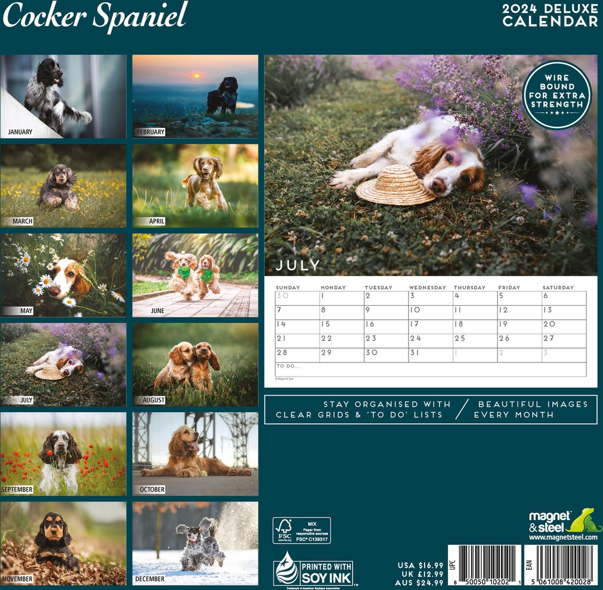 Ein Jahr voller niedlicher Cocker Spaniel! Dieser quadratische Wandkalender für 2026 zeigt monatlich neue bezaubernde Fotos dieser liebevollen Hunderasse. Mit großen Datumsfeldern für deine Termine und Notizen, Spiralbindung für einfaches Umblättern und Aufhänger für Wand oder Pinwand. Maße: 30x30cm, gedruckt auf hochwertigem Papier in Großbritannien. Perfekt fürs Büro, Wohnzimmer oder als Geschenk für Hundeliebhaber. Jeder Monat ein neues herzerwärmendes Motiv - von verspielten Szenen bis zu gemütlichen Schnappschüssen. Bringt jeden Tag ein Lächeln ins Gesicht!