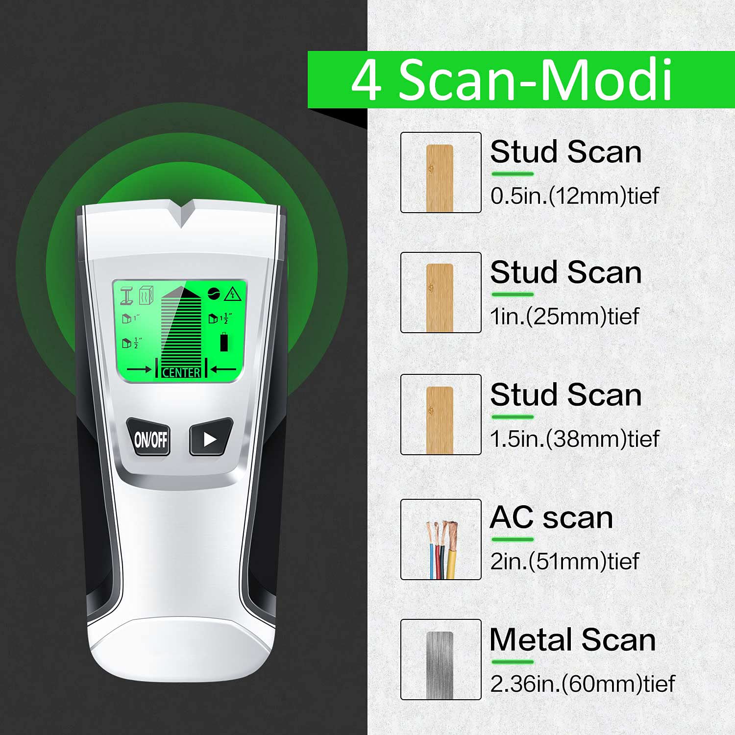 Nie wieder blind bohren! Dieser 6-in-1 Leitungssucher findet alles in deinen Wänden: Stromleitungen, Metallteile und Holzbalken. Mit 6 Scanmoden für verschiedene Tiefen bis 80 mm. Das große LCD-Display zeigt dir genau an, was sich hinter der Wand verbirgt. Akustischer Signalton und LED-Anzeige führen dich zum Ziel. Automatische Kalibrierung und Abschaltung nach 5 Minuten. Robuste, orangefarbene Hülle, ergonomischer Griff. Inklusive 9V Batterie. Perfekt für Heimwerker - bohre sicher und vermeide teure Schäden!