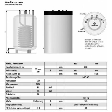 Immer warmes Wasser, wann du es brauchst! Dieser Warmwasserspeicher mit 120 Litern Fassungsvermögen ist ideal für die zentrale Warmwasseraufbereitung. Perfekt für Öl-, Gas- oder Festbrennstoffkessel. 🔥 Mit einem großen Wärmetauscher (1,15 m² Fläche) und Magnesiumschutzanode gegen Korrosion. Der Speicher ist aus Stahl mit Blue Glass-Beschichtung (WRAS-zertifiziert) und hat eine hochwirksame Polystyrol-Dämmung – so gehen kaum Wärme verloren! Anschlüsse sind oben, inklusive Zirkulations- und Entleerungsanschluss. Maße: 845 x 561 x 576 mm, Gewicht: 54 kg. Energieeffizienzklasse C. Achtung: Sicherheitsventil nicht im Lieferumfang – bitte separat bestellen. Einfache Installation dank regelbarer Stellfüße und eckiger Form, die auch bei wenig Platz gut unterkommt. Ideal für Haushalte mit mehreren Entnahmestellen – duschen, waschen, spülen, ohne dass das Wasser kalt wird! Robust, langlebig und effizient – deine Lösung für kostengünstiges Warmwasser.