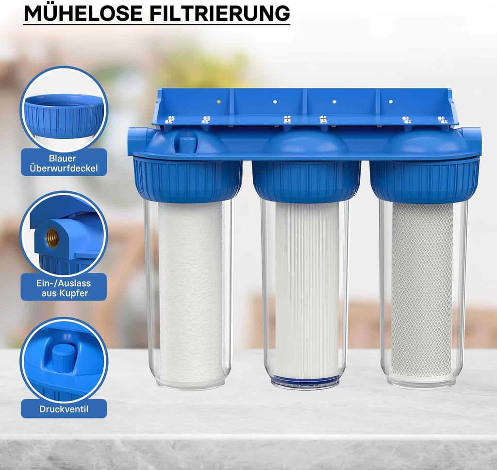 Zwei Filterstufen: 5µ Sedimentfilter gegen Sand, Rost und Schwebeteilchen, plus 5µ Aktivkohle-Block gegen Chlor, Pestizide und Gerüche. Ohne Chemie, nur mit physikalischer Filtration.