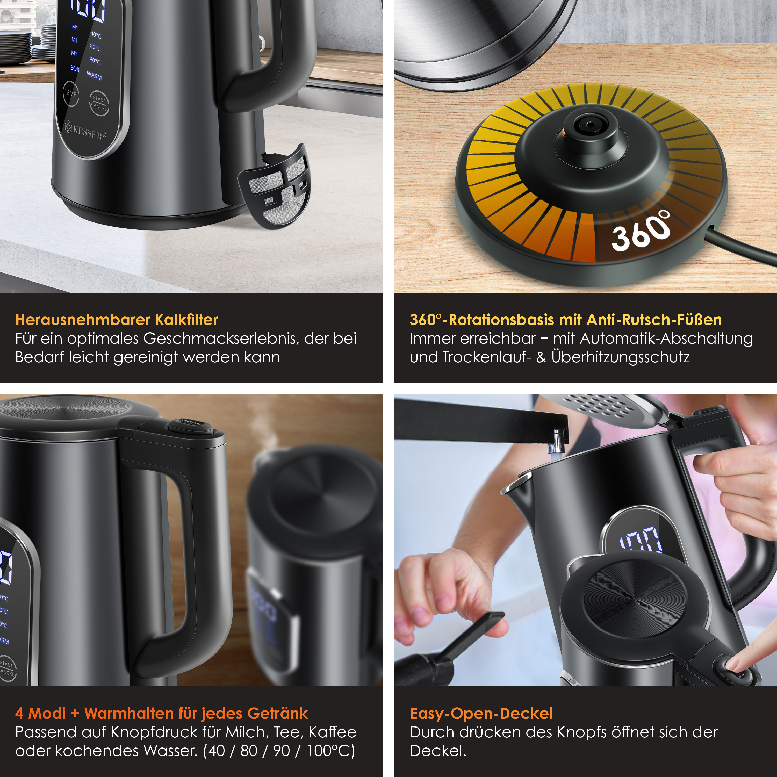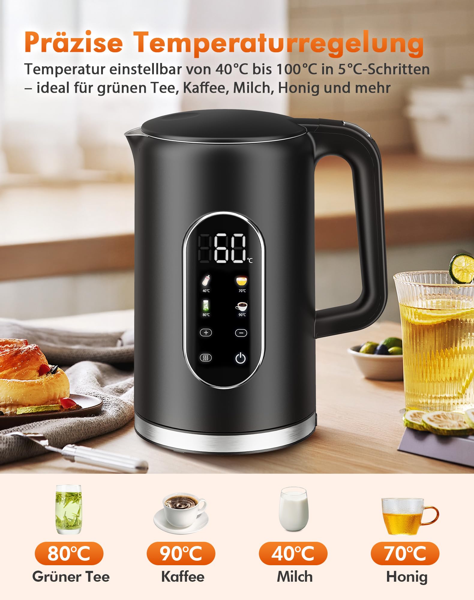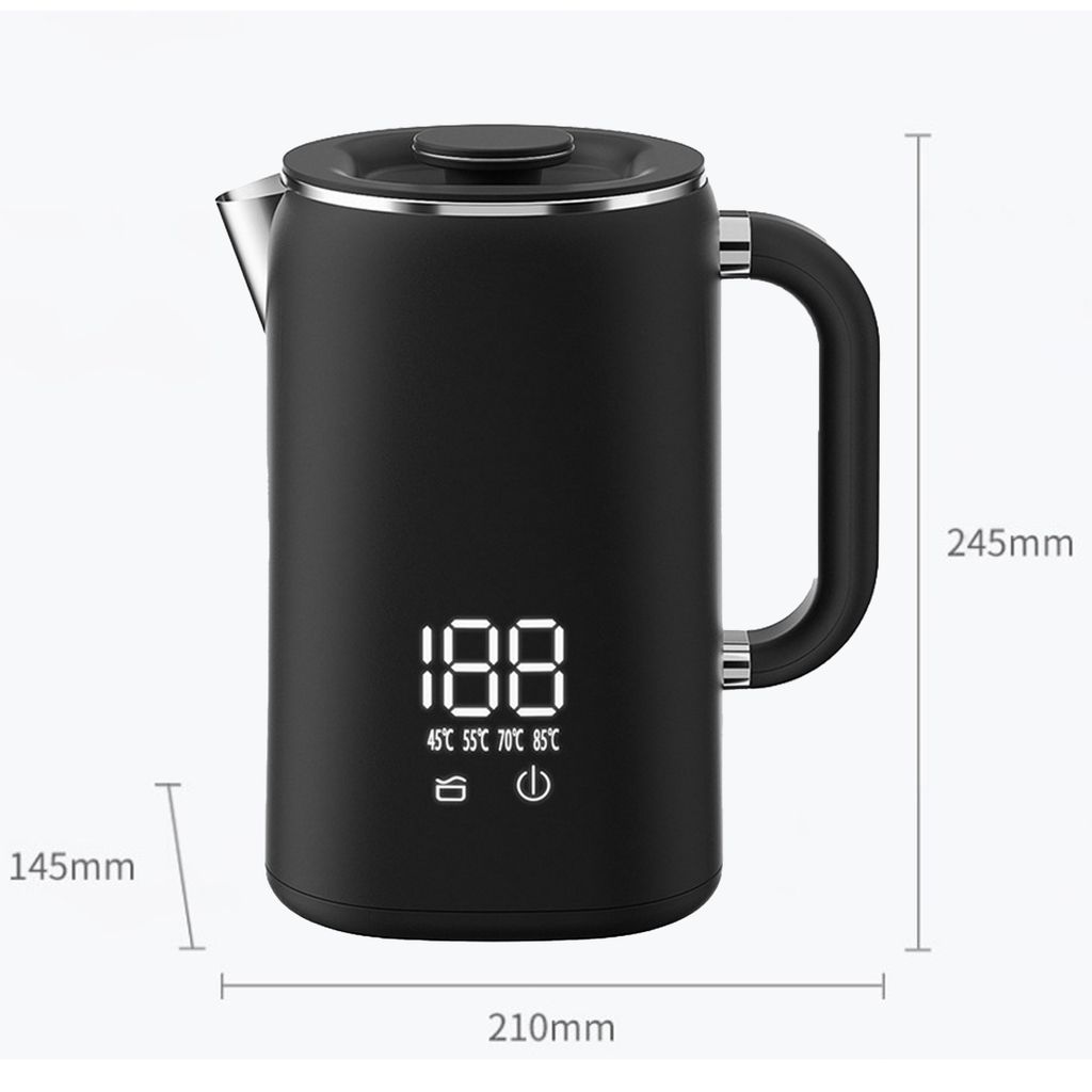 Boah, dieser Wasserkocher hat ja alles! Mit Temperaturregelung von 40°C bis 100°C in 5°-Schritten - perfekt für jeden Tee und Kaffee. 2000 Watt Power, damit dein Wasser richtig schnell heiß wird. Der 1,7 Liter Tank aus 304 Edelstahl ist BPA-frei und super gesund. Die doppelwandige Konstruktion bleibt außen kühl - super sicher! Mit praktischer Warmhaltefunktion für bis zu 2 Stunden. Die LED-Anzeige zeigt dir immer genau an, was los ist. Automatische Abschaltung und Trockenlaufschutz sorgen für totale Sicherheit. Schwarz, modern und stylisch - sieht in jeder Küche gut aus. Einfach den perfekten Begleiter für deine Heißgetränke!