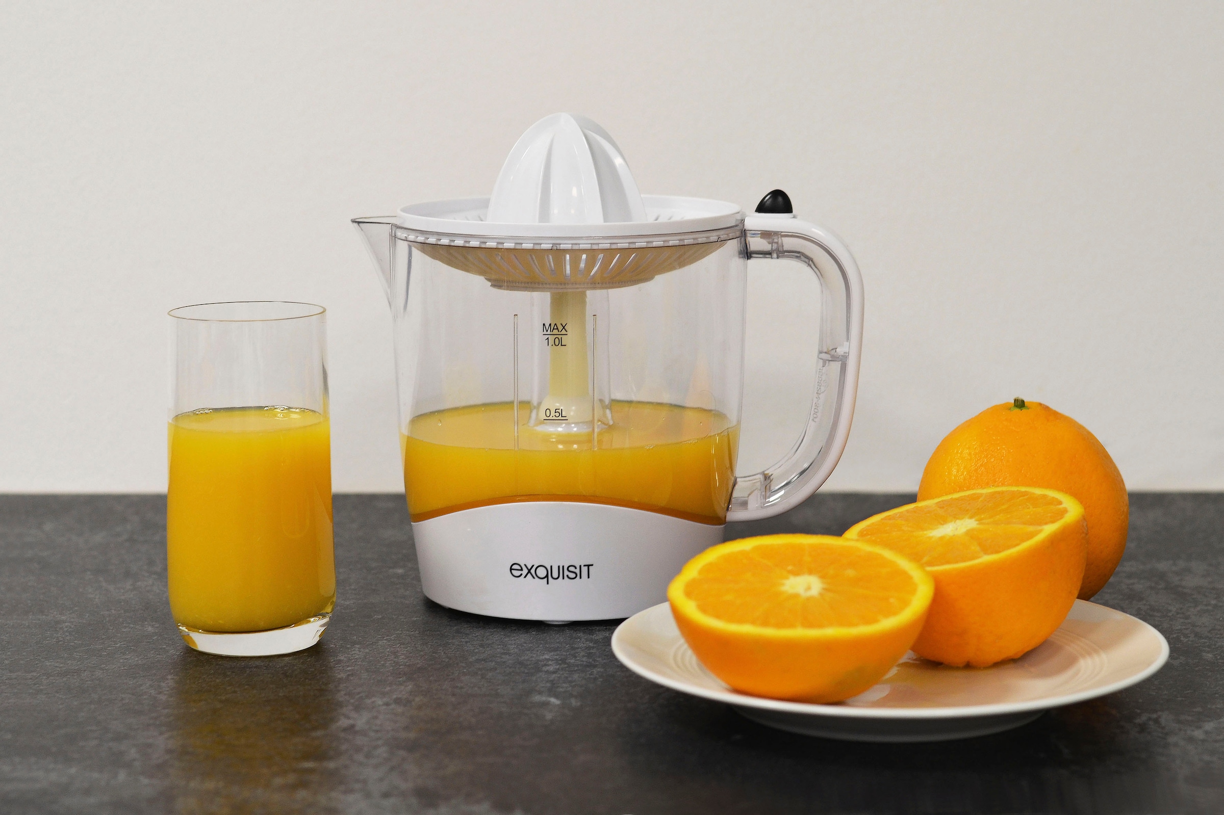 Frisch gepresster Saft in Sekunden! Die Exquisit ZP 3001 macht's möglich. Mit cleverer Start-Stopp-Automatik - einfach Frucht draufdrücken und sie startet von selbst. Die zwei verschiedenen Presskegel passen für große und kleine Zitrusfrüchte. Rechts- und Linkslauf für maximale Saftausbeute - da bleibt nichts übrig! Der transparente Behälter fasst 1 Liter und hat eine praktische Messskala. Mit 30 Watt Power und rutschfesten Füßen. Super einfach zu reinigen - alle Teile (außer Motor) sind spülmaschinengeeignet. Perfekt für Orangensaft am Morgen oder Zitronen für's Dressing. Einfach ein geniales Küchengerät das wirklich funktioniert! Mach deinen Saft einfach selbst - frischer und gesünder geht's nicht!