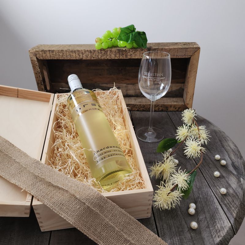 Das perfekte Hochzeitsgeschenk für das frisch vermählte Paar! Dieses edle Set enthält 2 personalisierte Weißweingläser von Leonardo, eine hochwertige Holzkiste mit Gravur und eine Flasche Chardonnay Weißwein. Alles wird mit den Namen des Paares, dem Hochzeitsdatum und einem romantischen Motiv graviert - total persönlich! Die Gläser haben 370ml Fassungsvermögen und sind spülmaschinenfest. Die Holzkiste mit Metallverschluss sieht richtig edel aus und ist perfekt zur Aufbewahrung. Der französische Weißwein (12% vol) rundet das Geschenk perfekt ab. Einfach beim Bestellen die persönlichen Daten angeben - wir erledigen den Rest. Ein Geschenk, das garantiert in Erinnerung bleibt!