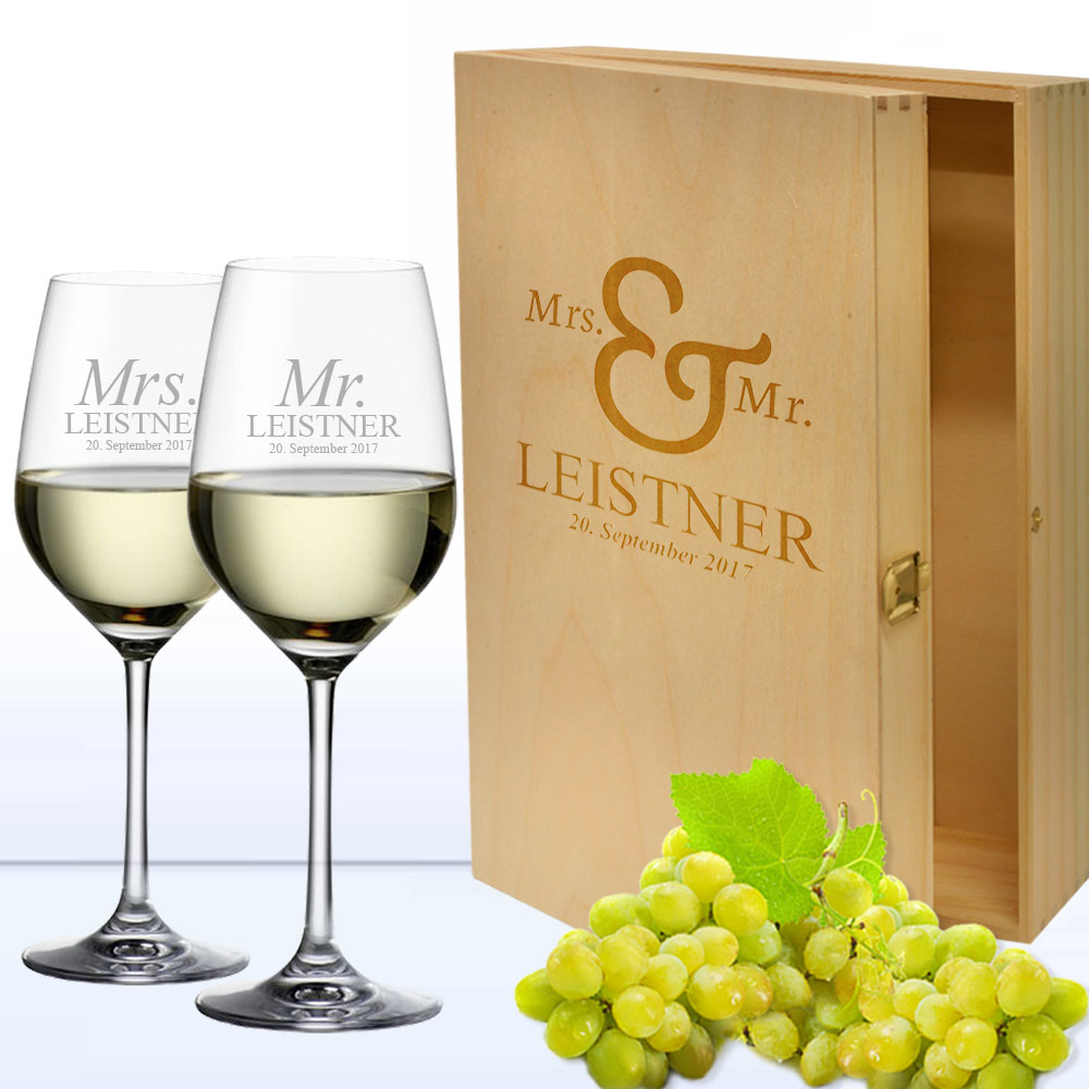 Hochzeitsgeschenk Set - 2 Gravierte Weißweingläser Mit Holzkiste & Wein