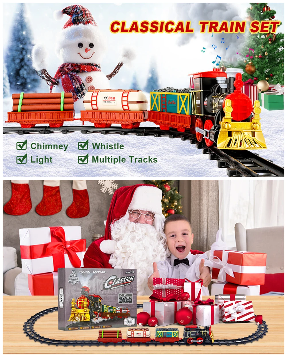 Alter, das ist ja der Hammer! Diese Weihnachts-Eisenbahn bringt richtig Stimmung in dein Weihnachtszimmer. Der elektrische Zug hat alles, was das Herz begehrt: Echten Rauch, der aus dem Schornstein kommt (einfach Wasser einfüllen), coole LED-Lichter und super realistische Zuggeräusche. Inklusive Hupe - wie bei einer echten Lok! Das Set hat alles dabei: Eine Dampflokomotive, einen Wagen, einen Kohlewagen und 9 gebogene Gleise. Dazu noch Verkehrszeichen und Landschafts-Requisiten für die perfekte Weihnachtsdekoration. Aus hochwertigem ABS-Material - robust und ungiftig, also perfekt für Kinder ab 3 Jahren. Der Aufbau ist super einfach: Gleise zusammenstecken, Zug draufstellen, 4 AA-Batterien rein (nicht im Lieferumfang) und los geht die Fahrt! Die Waggons werden einfach mit Haken verbunden - halten bombenfest. Perfekt als Weihnachtsgeschenk für Jungen und Mädchen. Stell sie unter den Weihnachtsbaum und lass den Zug seine Runden drehen - das sieht einfach magisch aus! Fördert die Hand-Augen-Koordination und macht riesigen Spaß. Weihnachten kann kommen!