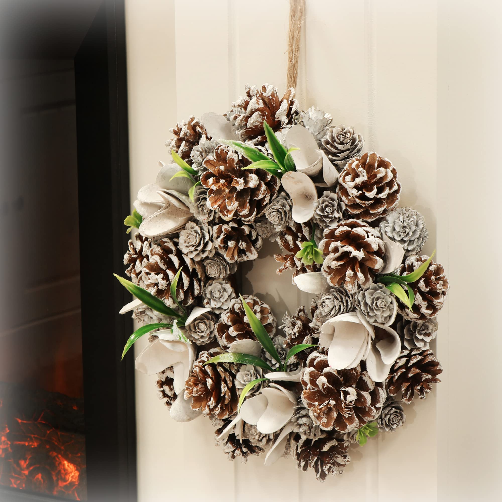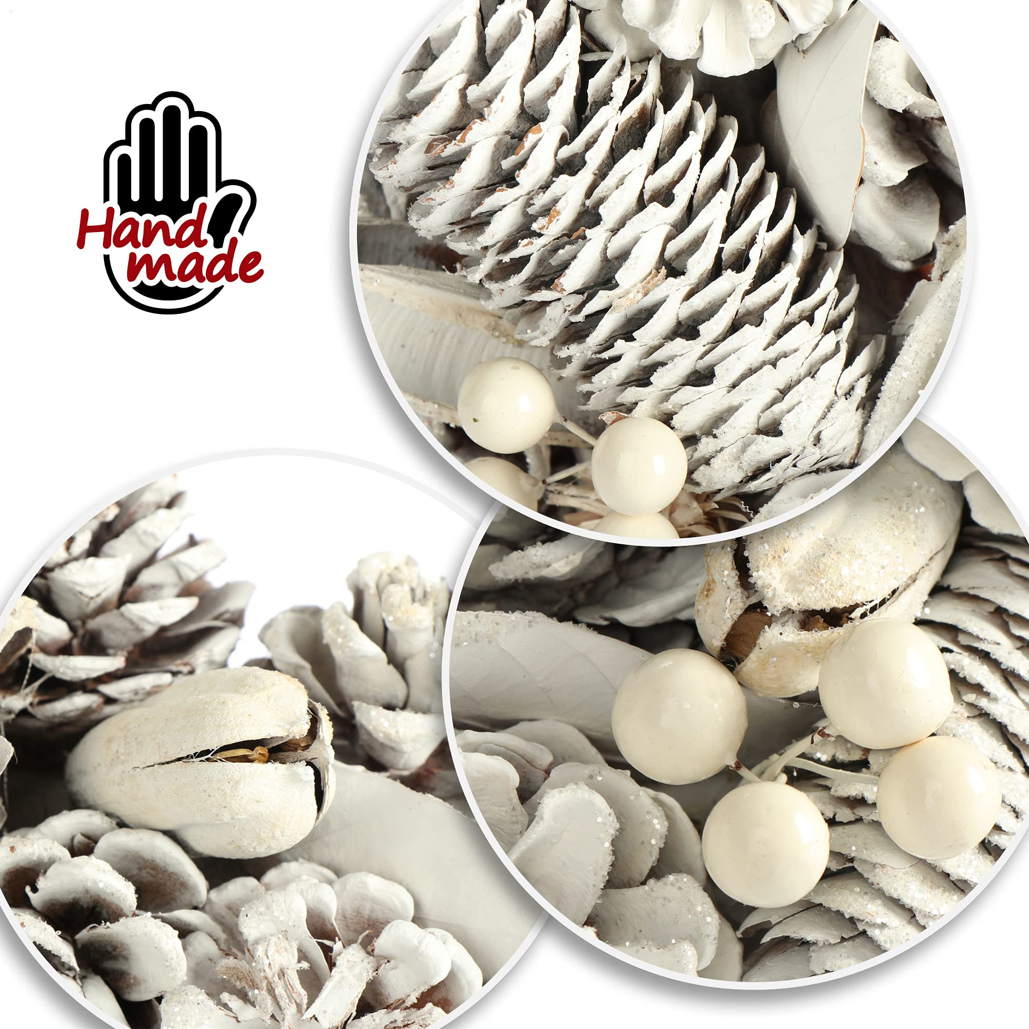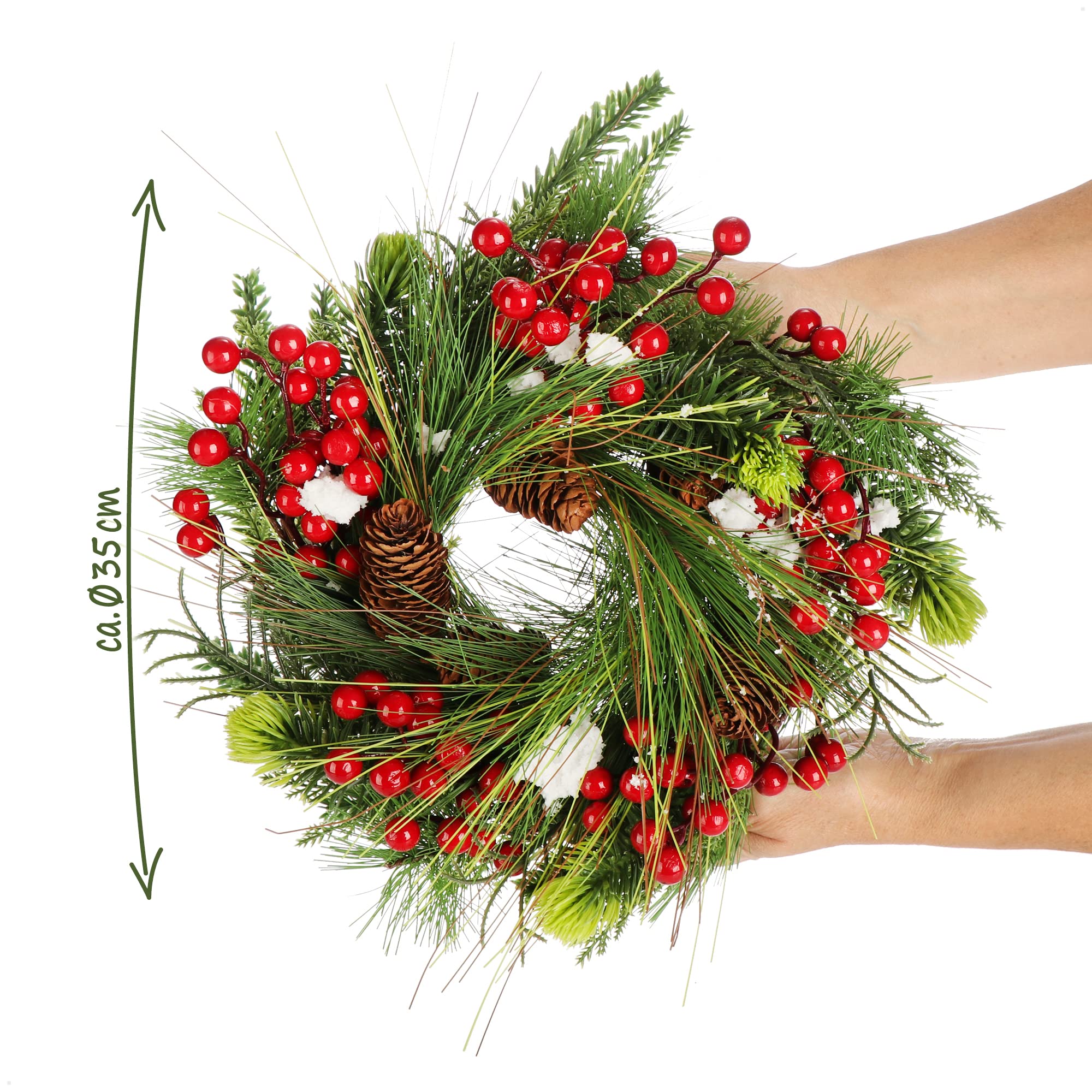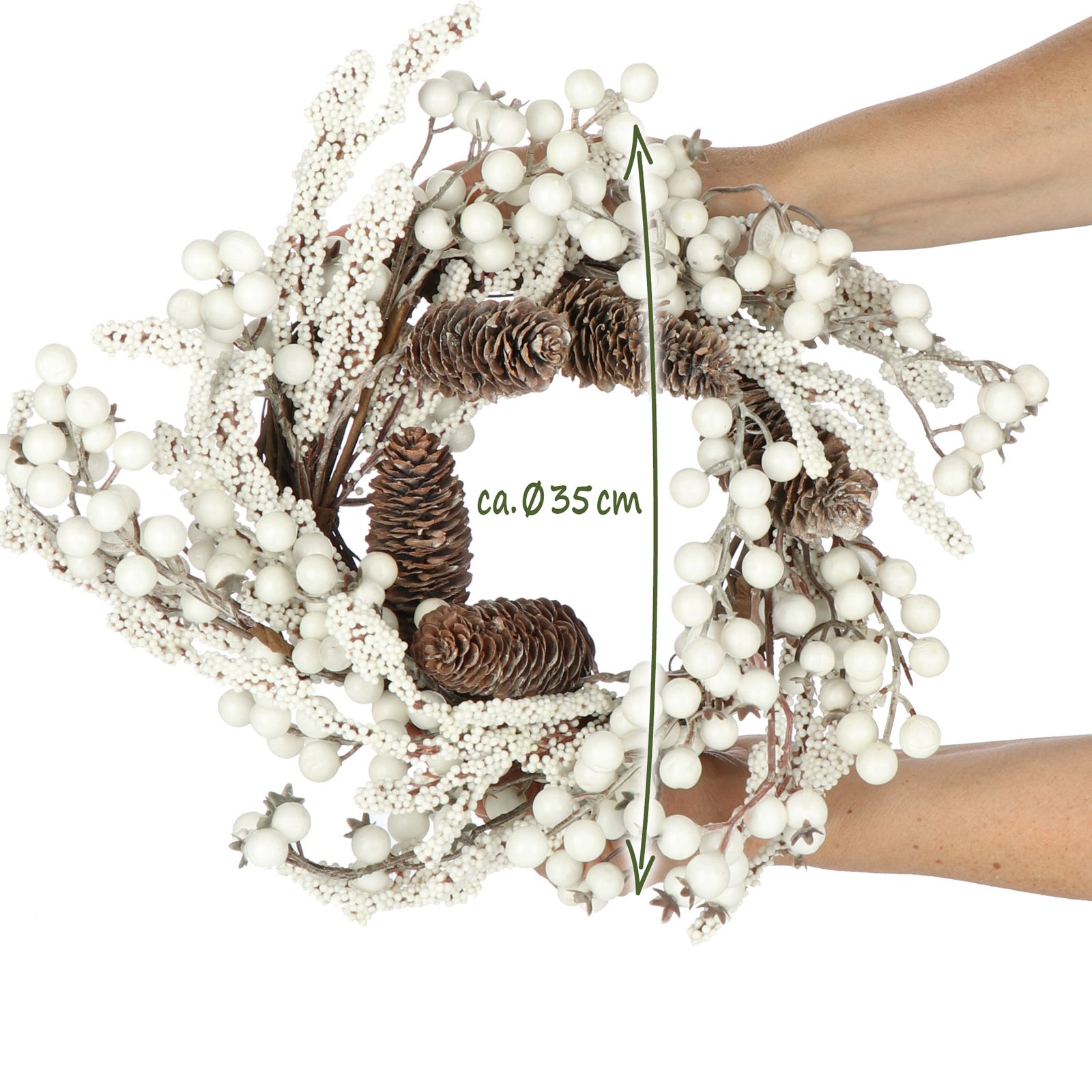 Oh, wie weihnachtlich! Dieser COM-FOUR Weihnachtskranz mit 35cm Durchmesser bringt sofort festliche Stimmung in dein Zuhause. Mit natürlichen Pinienzapfen, weißen Beeren und Zweigen sieht er aus wie frisch aus dem Winterwald.\\n\\nSuper vielseitig einsetzbar - als Türkranz, Tischkranz, Adventskranz oder zum Aufhängen an der Wand. Aus Zapfen, Zweigen, Kunststoff und Styropor in den Farben Braun und Weiß.\\n\\nPerfekt für DIY-Fans: Du kannst den Kranz weiter verzieren und tolle weihnachtliche Gestecke selbst basteln. Ein Spaß für die ganze Familie in der kalten Jahreszeit! Auch als Geschenkidee für Freunde und Familie super. Achtung: Nicht für Kinder unter 3 Jahren wegen Kleinteilen!