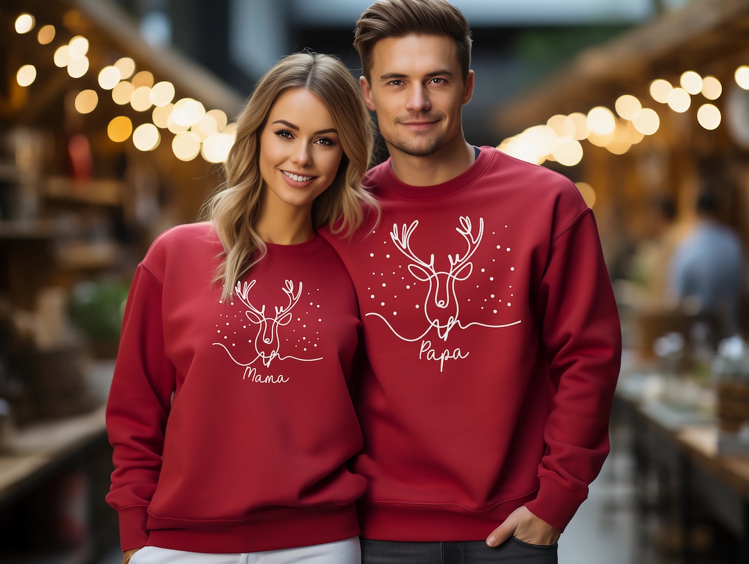 Gleich anziehen und Weihnachtsstimmung verbreiten! Dieses lustige Weihnachtspullover-Set für die ganze Familie bringt jeden in Festtagslaune. Mit dem niedlichen Rentier-Motiv seid ihr der Hit auf jeder Weihnachtsfeier. Die Pullover haben einen bequemen Rundhals-Ausschnitt und sind aus weichem Sweatshirt-Stoff gemacht - perfekt für gemütliche Winterabende. Ob fürs Familienfoto, die Weihnachtsfeier oder einfach nur für daheim - in diesen Pullis macht Feiern gleich doppelt Spaß. Super pflegeleicht und für die gesamte Weihnachtszeit gemacht. Damen, Herren und Kinder - alle finden ihre passende Größe. Macht eure Weihnachten noch besonderer mit diesen matching Pullovern die garantiert für Lacher sorgen. Ugly Christmas Sweater mal anders - nicht hässlich, sondern richtig stylisch!