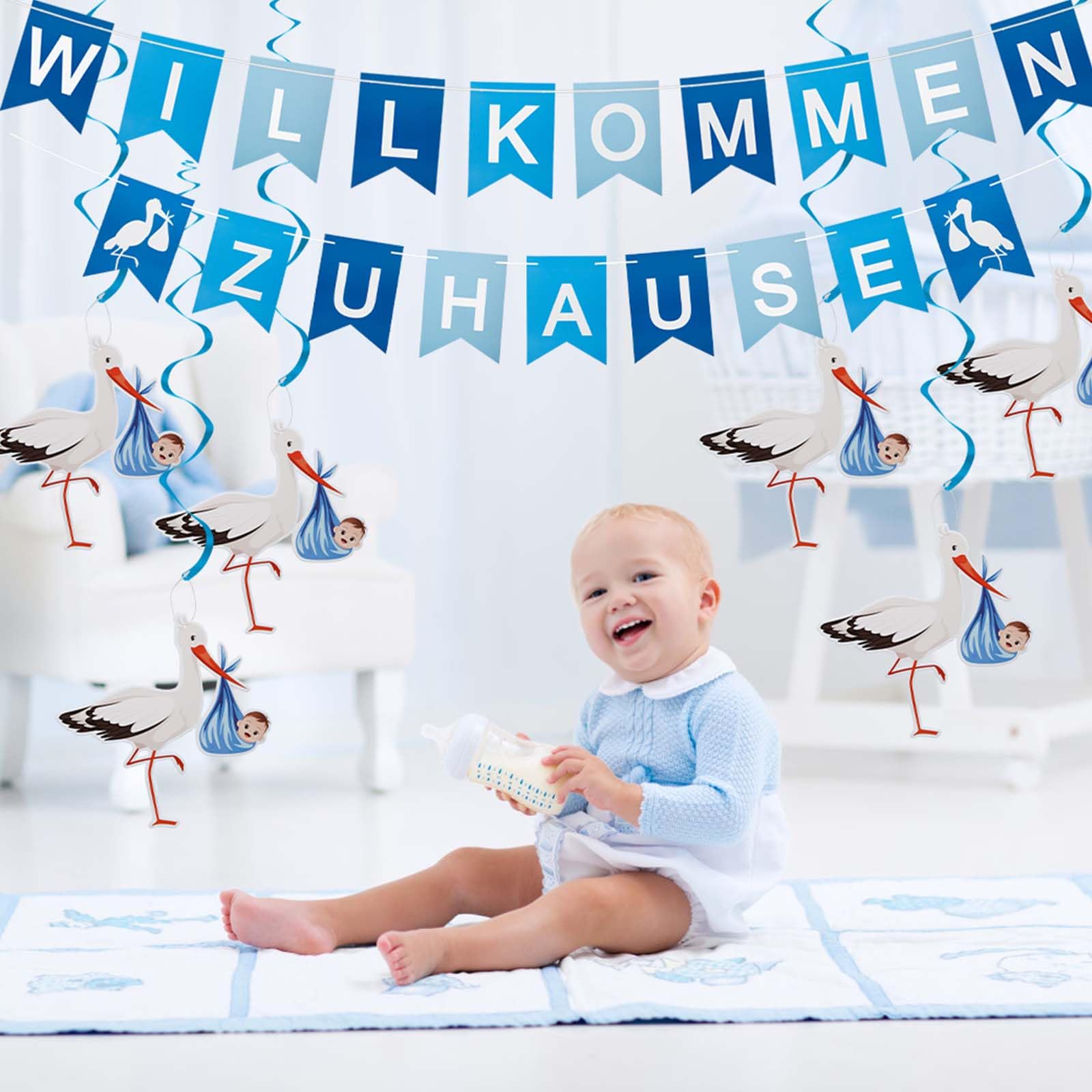 Ein neues Baby kommt nach Hause - was für ein besonderer Moment! Dieses süße Welcome Home Banner mit Storch-Motiv macht die Begrüßung unvergesslich. Komplett mit 19 Papp-Elementen, 6 Störchen und allem Montage-Zubehör.