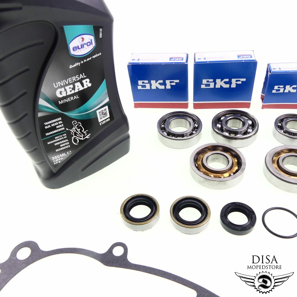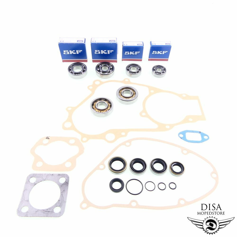 Hey, für alle Kreidler-Fans da draußen! Hier ist das Komplett-Set für euren 5-Gang Motor - ob Florett, K54, RS, RMC oder Mustang. Das Paket hat wirklich alles, was ihr für eine Rundum-Erneuerung braucht! 🛠️\n\nWas genau ist drin? Na, ein vollständiger Dichtsatz mit allen wichtigen Dichtungen für Gehäuse, Zylinderkopf, Kupplungsdeckel und mehr. Dazu kommen spezielle Wellendichtringe für Kurbelwelle, Hauptwelle und Kickstarter - die halten dicht, damit kein Öl mehr unerwünscht austritt! Und das Beste: Ein Satz hochwertiger Lager inklusive Nadellager, alle von SKF und damit absolute Qualität.\n\nDie technischen Daten im Überblick:\n• Dichtsatz mit Lochabstand 44 mm\n• Ansaugstutzen: 39 mm Abstand, 14x23 mm Durchlass\n• Krümmerdichtung 32x38x3 mm\n• Wellendichtringe: 17x28x8 mm (Kurbelwelle) und 15x24x7 mm (Hauptwelle)\n• Verschiedene O-Ringe in 8mm, 9,5mm, 13mm und 22mm\n• Lager: 6004 C3, 6201 C3, 6202 C3, 6302 C3, BO17 und Nadellager 14x18x13 mm\n\nDas ist übrigens kein No-Name Zeug - die Teile entsprechen den originalen Kreidler-Nummern! Perfekt also für die nächste Motorrevision oder wenn einfach mal was erneuert werden muss. Alles in einer Bestellung, kein langes Suchen und Zusammenstellen mehr. Einfach bestellen, einbauen und wieder richtig Spaß mit dem Kreidler haben! ✨