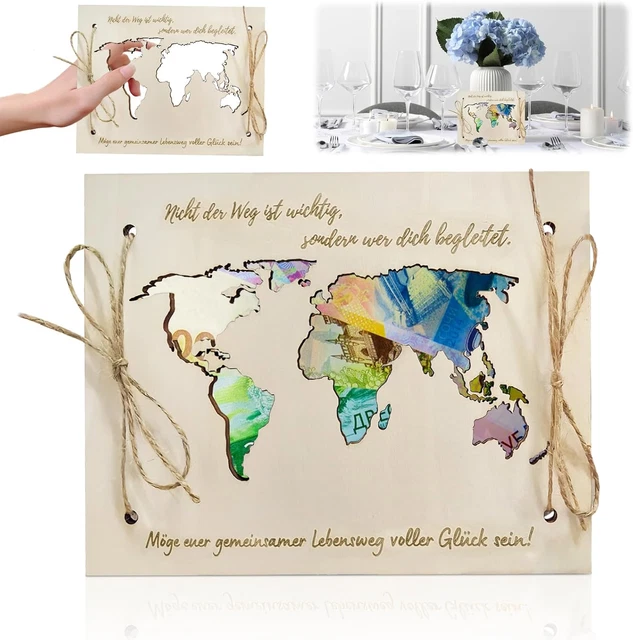 Wow, dieses Geldgeschenk von Bewudy ist einfach mal was anderes! Aus natürlichem Buchenholz gefertigt, 14x19cm groß mit 31cm Seillänge. Das coole Feature: Wenn du Geldscheine zwischen die Holzplatten legst, leuchtet die ausgefräste Weltkarte in bunten Farben auf! Je mehr verschiedene Scheine, desto bunter wird die Karte. Perfekt um dem Brautpaar nicht nur Geld, sondern auch eine bleibende Erinnerung zu schenken. Du kannst persönliche Wünsche direkt auf die Karte schreiben. Super für Hochzeiten, Geburtstage, Jubiläen oder als Reisegeschenk. Macht jedes Geldgeschenk zu einem besonderen Moment! Die Holzoberfläche ist super glatt und die Gravur ist richtig schön gemacht. Einfach Geldscheine reinlegen, zubinden und du hast ein Geschenk das wirklich ankommt!
