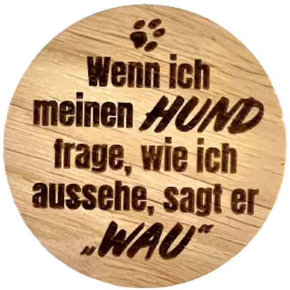 Total niedlicher Holzmagnet mit lustigem Hundespruch! 'Wenn ich meinen Hund frage, wie ich aussehe, sagt er Wau' - wer Hundebesitzer ist, kennt das Gefühl! Aus nachhaltigem Eichenholz gefertigt, fühlt sich der Magnet richtig wertig an. Mit 6cm Durchmesser und 1cm Stärke hat er die perfekte Größe für Kühlschrank, Whiteboard oder jede andere metallische Fläche. Die Gravur ist per Laser eingearbeitet und bleibt ewig lesbar - keine Sorge, dass sie verblasst! Die geölte Oberfläche betont die natürliche Holzmaserung und macht jedes Stück zum Unikat. Perfekt als Geschenk für Hundefreunde, als Mitbringsel oder einfach zur Dekoration in der eigenen Küche. Sieht nicht nur gut aus, sondern hält auch sicher mit seinem starken Magnet. Ein kleiner Hingucker, der immer für ein Schmunzeln sorgt. Einfach anschießen und den Tag versüßen!