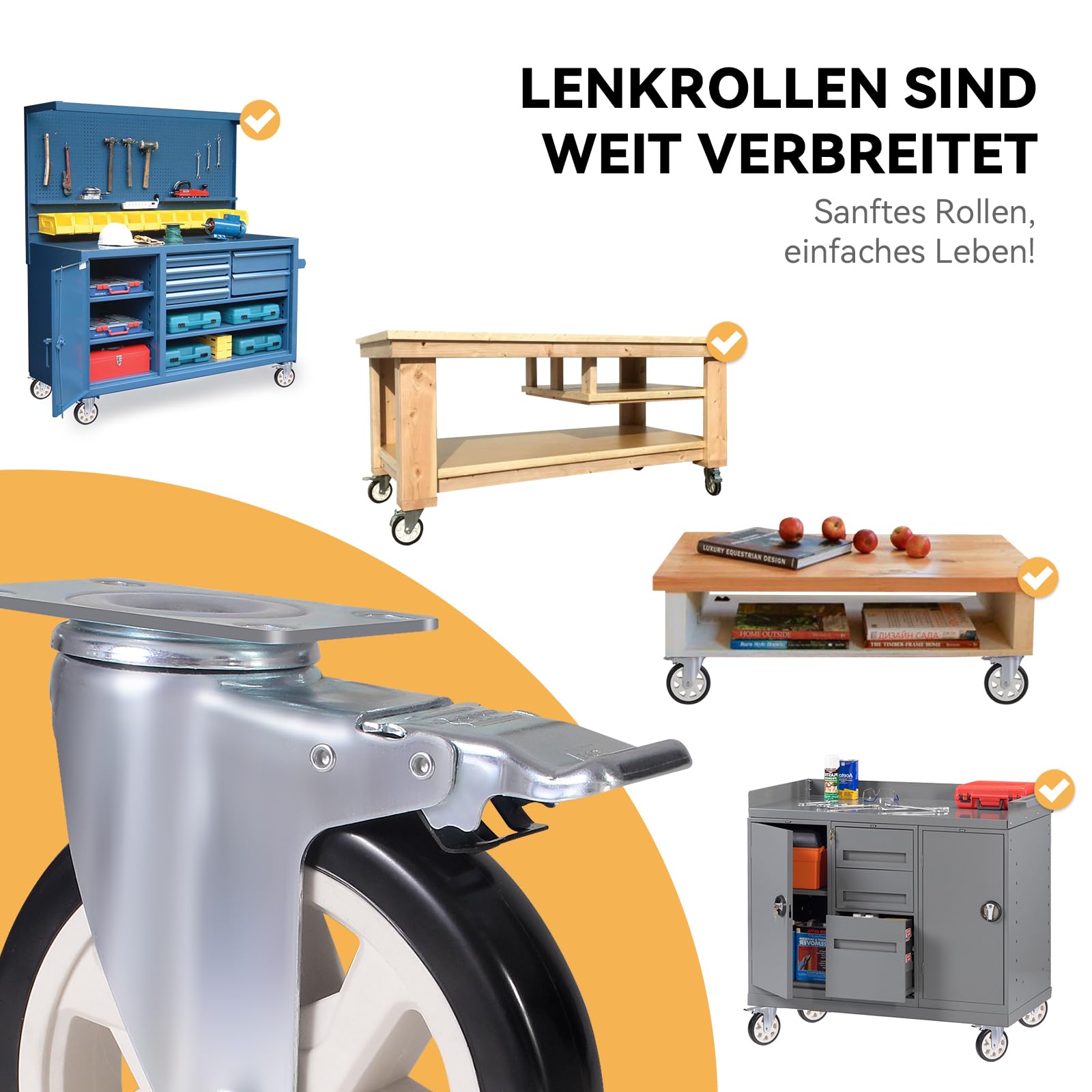 Mach deine Werkbank mobil! Diese 4 Schwerlastrollen mit 63,5mm Durchmesser heben deine Werkbank um ca. 19mm an und machen sie so leicht beweglich. Mit dem praktischen Fußpedal einfach drauftreten zum Anheben, loslassen zum Absenken - kein Bücken nötig! Hält bis zu 300kg Gesamtgewicht aus und ist damit perfekt für Garage, Werkstatt oder Hobbyraum. Die 360° drehbaren PU-Rollen laufen super leise und lassen sich leicht in jede Richtung schieben. Ideal für glatte Böden wie Beton, Fliesen oder versiegeltes Holz. Komplett-Set mit allen Schrauben und Muttern - einfach seitlich an der Werkbank montieren und schon rollt sie wie von selbst!